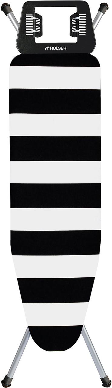 Дошка для прасування Rolser K-UNO Blanco/Negro (K01015-2064) - якісний продукт з сучасним дизайном та широким функціоналом. Перфорована основа робочої поверхні запобігає утворенню конденсату. Більш ефективне прасування забезпечується тришаровим бавовняним чохлом, який відбиває тепло та пар. Підставка під праску стійка до високих температур. Модель регулюється по висоті в десятьох положеннях і обладнана автоматичним фіксатором. Трубчасті ніжки надають конструкції стійкості та легко кріпляться до дошки в складеному стані, що унеможливлює її випадкове відкриття.