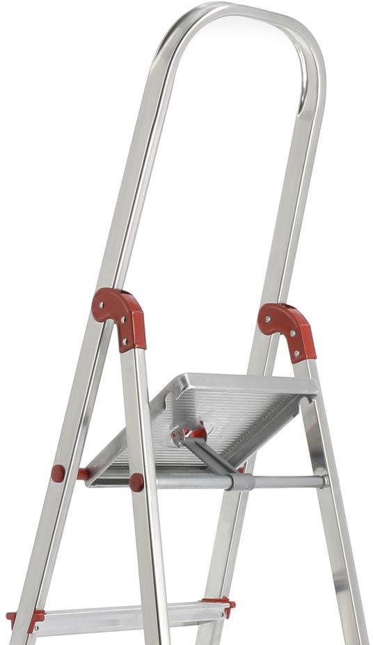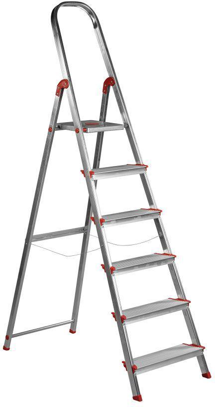 Драбина Rolser Escalera Norma 220 6 щаблів (NOR039) - міцна, універсальна, легка, безпечна. Сертифікована відповідно до європейського стандарту якості UNE-EN131. Максимальне навантаження - 150 кг. Модель рекомендована як для професійного, так і для домашнього використання. Драбина обладнана захистом від випадкового складання. Модель має шість щаблів з антиковзною структурою. Опорні ніжки мають пластиковий захист, який перешкоджає небажаному ковзанню. Дуже широкий щабель. Опорна арка з безпечною висотою 60 см. Бічні пази та поперечні трубки із зварного алюмінію. Петлі з холодноштампованої та лакованої сталі.