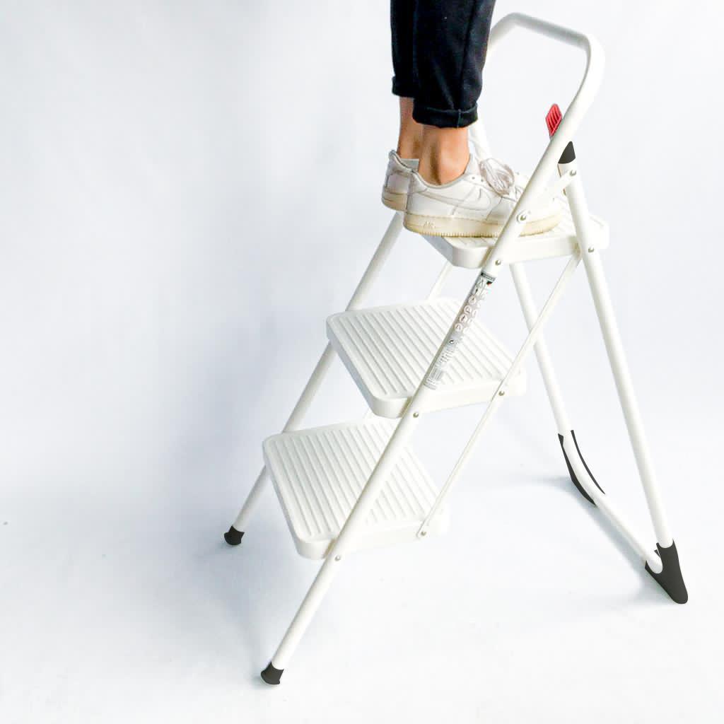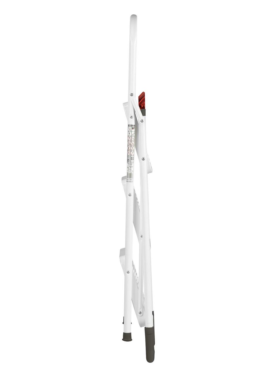 Драбина Rolser Taburete M/11 UNE 3 щаблі Blanco (MET004-1024) - надійний помічник в домашньому господарстві. Дана модель має три щаблі з протиковзним покриттям. Конструкція обладнана захистом від випадкового складання та розрахована на максимальне навантаження до 150 кг. Опорні ніжки мають пластикові накладки для більшої стійкості на слизьких поверхнях. Драбина сертифікована відповідно до європейського стандарту якості UNE EN-14183.