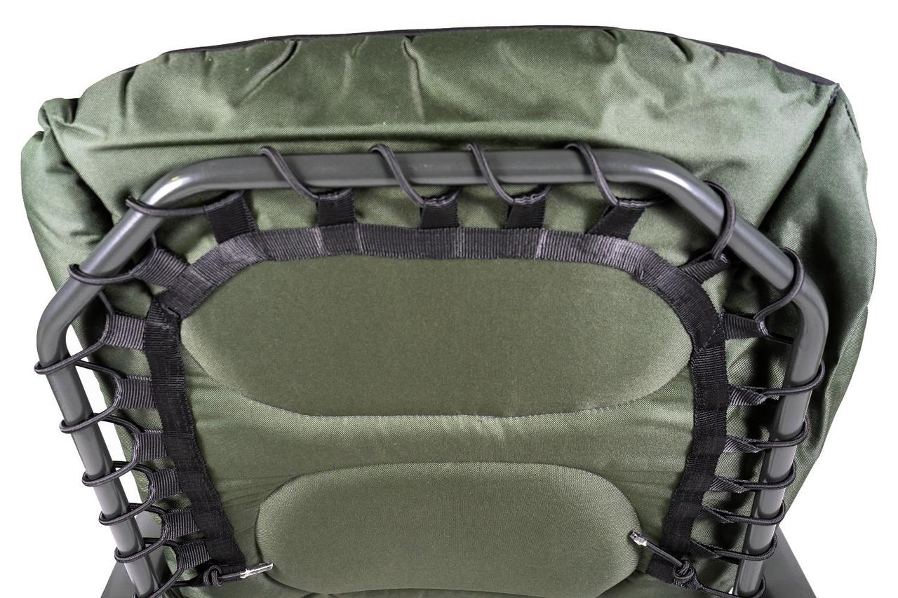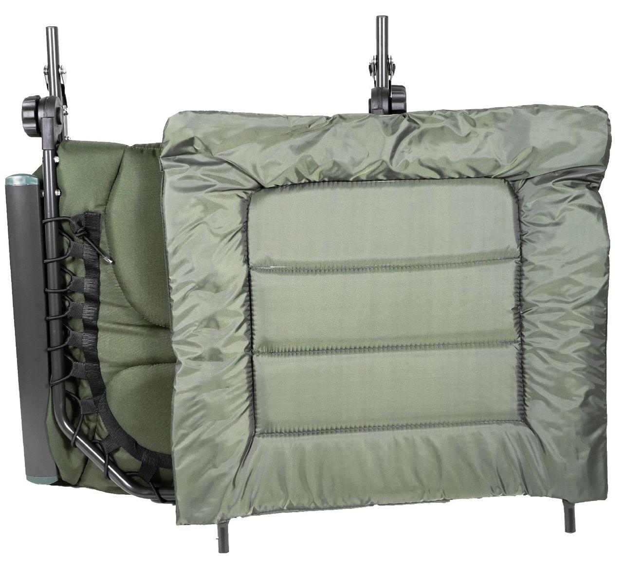 9 см. Сталева конструкція крісла потужна і, в той же час, максимально полегшена за рахунок алюмінієвих підлокітників. Для більшої зручності, в комплекті йде чохол для транспортування, Вам більше не треба шукати куди всунути крісло, або докупати чохол. Спинка регулюється під будь-яким кутом, аж до горизонтального положення, конструкція фіксатору- закрутка, більш надійніша. Завдяки тому, що конструкція крісла кріпиться болтами, можна легко зняти тканину для прання і без проблем кріпити обважування для риболовлі. При необхідності можна зняти підлокітники.У верхній частині крісла знаходиться м'яка подушка, окремо не потрібно буде брати з собою. У середній частині крісла передбачена додаткова вставка з наповнювачем з дихаючої тканини, завдяки чому, менш втомлюєшся і не буде жарко при довгому знаходженні на кріслі. Тканинна основа більше ніж ширина крісла, що в свою чергу при розкладеному кріслі, заходить на труби і підлокітники, і відповідно захищає від дотику з металом.Приставка має спеціальну тканинну вставку зі здатністю відштовхувати бруд і воду, але все ж, якщо вам вдасться її забруднити, то ви легко зможете видалити бруд з даної ділянки.Матрац з наповнювачем з піни створить вам ідеальні умови для комфортного відпочинку.