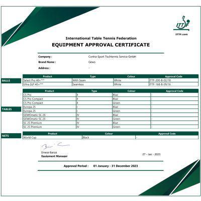 Стандарти, сертифікати : сертифіковано ITTF (Міжнародна федерація настільного тенісу)