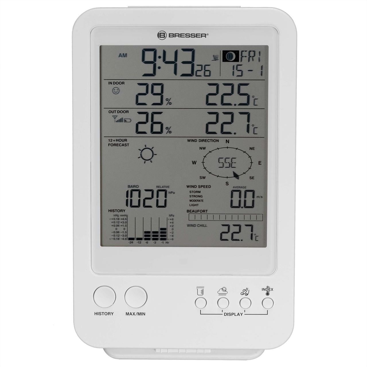 Метеостанція Bresser Weather Center 5-in-1 забезпечує вимірювання таких метеопараметрів як величина атмосферного тиску, швидкість і напрям вітру, рівень, опадів, температура і відносна вологість повітря, рівень комфорту в приміщенні. Вбудована функція тривожних сповіщень попередить вас про вихід вимірюваних параметрів за вказані межі. Усі датчики скомпоновані в єдиному блоці, що значно спрощує та прискорює процес встановлення та монтажу.