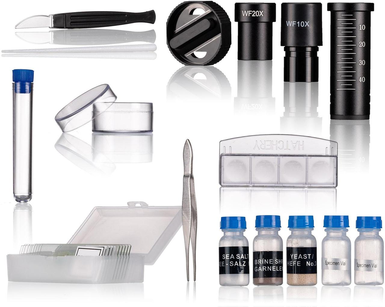 Максимум збільшення і нові яскраві кольори виділяють мікроскопи Bresser Biolux SEL з інших мікроскопів. Bresser Biolux SEL 40x-1600x Green з адаптером для смартфона (8855600B4K000) - це добре укомплектована модель бюджетного мікроскопа, забезпечена широким набором аксесуарів, а також адаптером планшета або смартфона, який забезпечить зйомку результатів спостережень за допомогою камери Вашого портативного пристрою або спостереження зразка з дисплея у реальному часі. Таким чином, мікроскоп безумовно буде цікавий і дітям і підліткам. Ця модель поставляється в чотирьох різних кольорах. Широкий набір аксесуарів, об'єктивів і окулярів, необхідних для старту спостережень, що дає можливість відразу поринути в такий цікавий мікросвіт. Комбінація двох ширококутних окулярів та трьох об'єктивів дає можливість отримати збільшення 800х. Досить корисним та цікавим є використання у підлітковому мікроскопі лінзи Барлоу для отримання безступінчастого (плавного) зумування зображення, завдяки чому досягається максимальне збільшення 1600х. Монокулярна насадка нахилена під кутом 45°, що безумовно зручно для спостережень. Світлодіоди забезпечують підсвічування препарату світлом, що проходить і відбитим. Світло, що проходить, використовується для спостереження прозорих об'єктів, що відображає – для непрозорих тривимірних. Використання двох ламп одночасно може бути корисним при спостереженні напівпрозорих зразків. Передача кольору і інтенсивність пучка світла контролюється діафрагмою з різними діаметрами отворів і п'ятьма світлофільтрами. У комплектацію входить адаптер для смартфона (планшета). Адаптер кріпиться на тубусі мікроскопа і дозволяє проводити фото і відеозйомку головною або передньою камерою гаджета. Гладка тильна сторона смартфона надійно кріпиться за допомогою безлічі присосок адаптера. Живлення мікроскопа здійснюється від трьох найпоширеніших батарей АА (LR6). Таким чином, мікроскоп незалежний від мережі змінного струму і може бути використаний навіть у польових умовах. Перелік аксесуарів включає готові слайди, до огляду яких можна розпочати негайно. Також у наборі є аксесуари для препарування зразків, мікротоми для самостійного приготування зразків, інкубаторій та препарати для самостійного приготування. Незважаючи на те, що даний прилад швидше буде цікавим для дітей та підлітків, всі оптичні елементи виконані зі скла, серйозне збільшення дозволить розглянути більшість з того, що доступне "дорослому" біологічному мікроскопу.
