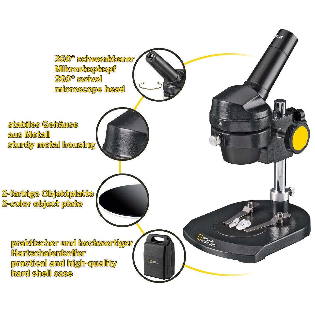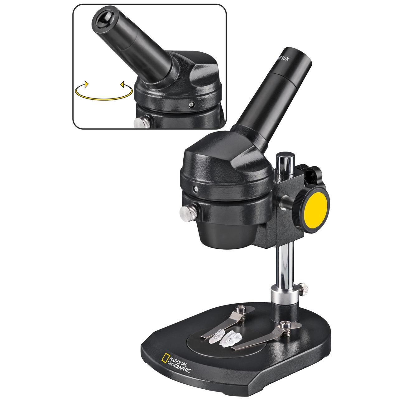 Перший монокулярний стереоскопічний мікроскоп призначений для дітей та підлітків може дати фору багатьом подібним спеціалізованим мікроскопам завдяки великому діапазону робочого ходу, стійкому металевому корпусу та механічних вузлів, виконаних з металу. Крім того, мікроскоп поміщений у спеціальний пластиковий захисний кейс, що навряд чи можна зустріти серед приладів такого рівня. Мікроскоп National Geographic Mono 20x (з кейсом) забезпечує об'ємне стереоскопічне зображення та має широке застосування у таких областях як мінералогія, ентомологія, ботаніка, нумізматика, ремонтні роботи та ін.