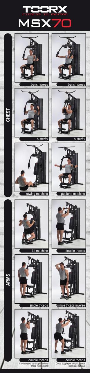 Мультистанция Toorx Multifunction Station MSX 70 (MSX-70) - универсальный многофункциональный силовой тренажер для дома, с помощью которого вы сможете поддерживать свое тело в соответствующей форме. Благодаря продуманной конструкции и комплектации дополнительными приспособлениями, на тренажере возможно выполнять много различных силовых упражнений на все группы мышц. Данная модель имеет 102-килограммовый наборный весовой стек для максимального уровня нагрузки. Несомненное преимущество фитнес-станции - ее компактные размеры, позволяющие пользоваться тренажером даже в условиях городской квартиры.