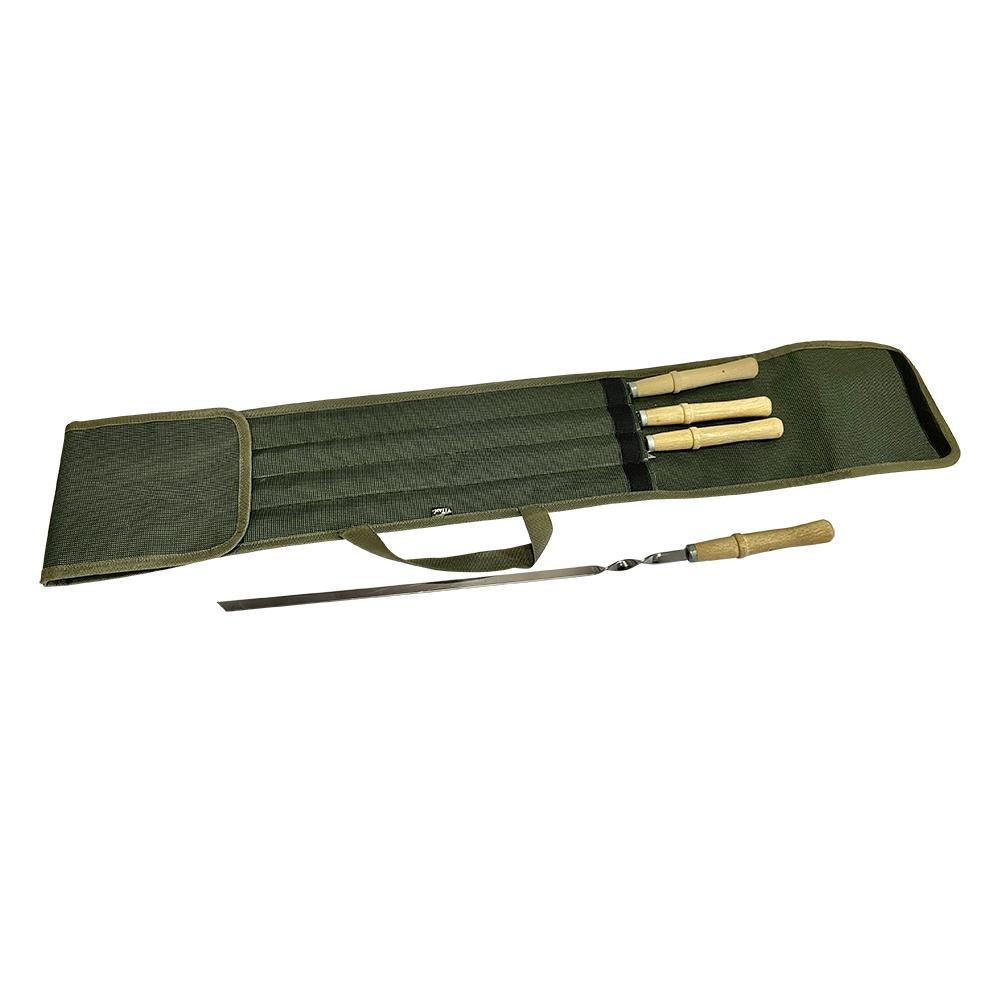 В комплекті: - шампур із дерев'яною ручкою, 8 шт. (З нержавіючої сталі, товщина 2 мм; розміри, мм: довжина 590, довжина робочої поверхні 370, ширина 10) - Чохол, 1 шт. (тканина - "меланж" зелений)