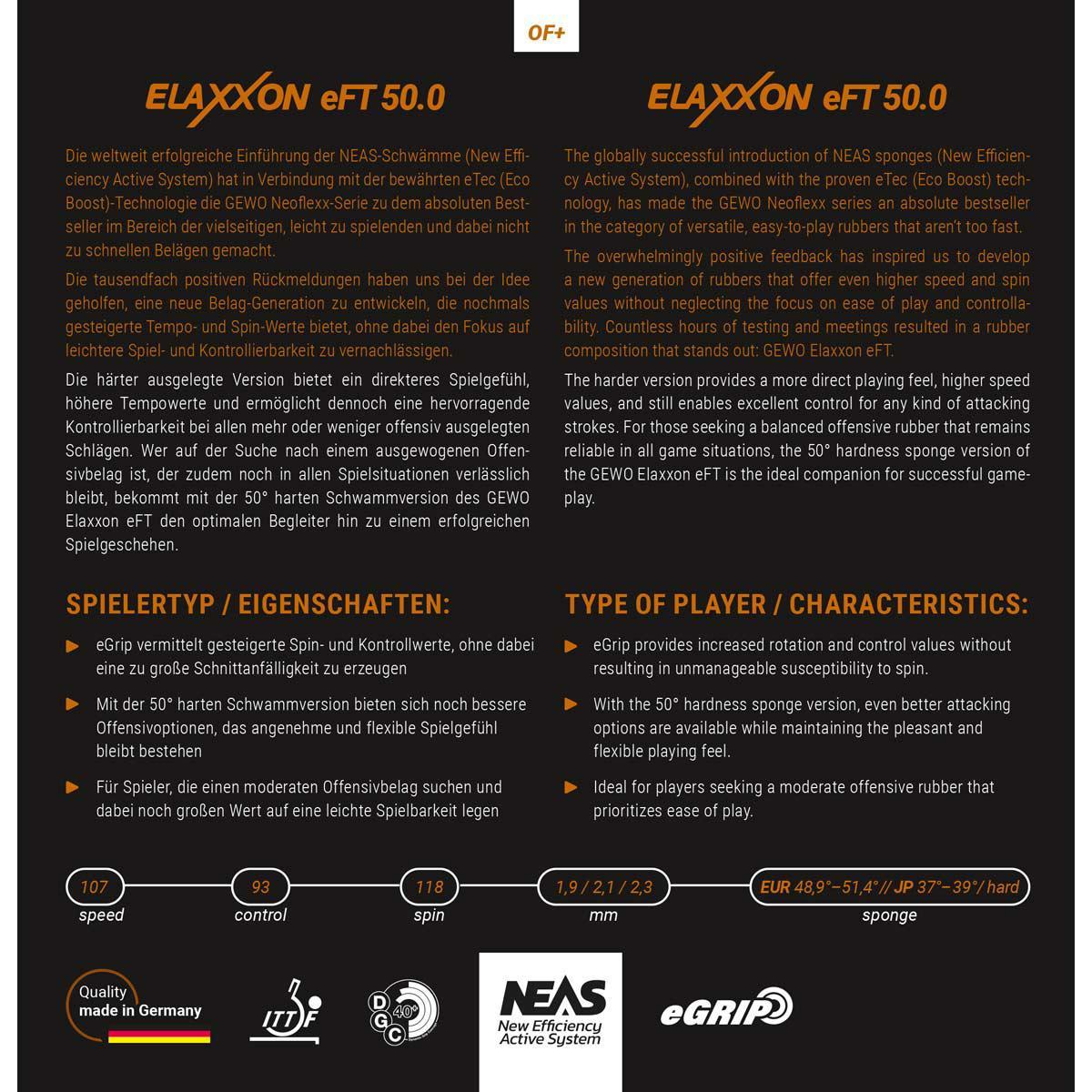 Успішне впровадження в усьому світі губок NEAS (New Efficiency Active System) у поєднанні з перевіреною технологією eTec (Eco Boost) зробило серію GEWO Elaxxon абсолютним бестселером у категорії універсальних, легких у грі та не надто швидких гум. Надзвичайно позитивні відгуки надихнули нас на розробку нового покоління гум, які пропонують ще вищі показники швидкості та обертання, не нехтуючи акцентом на легкості гри та керованості. Новими варіантами гуми GEWO Elaxxon eFT будуть насолоджуватися молоді гравці або ті хто бажає трохи більше швидкості та різноманітності, не жертвуючи надто великим контролем.