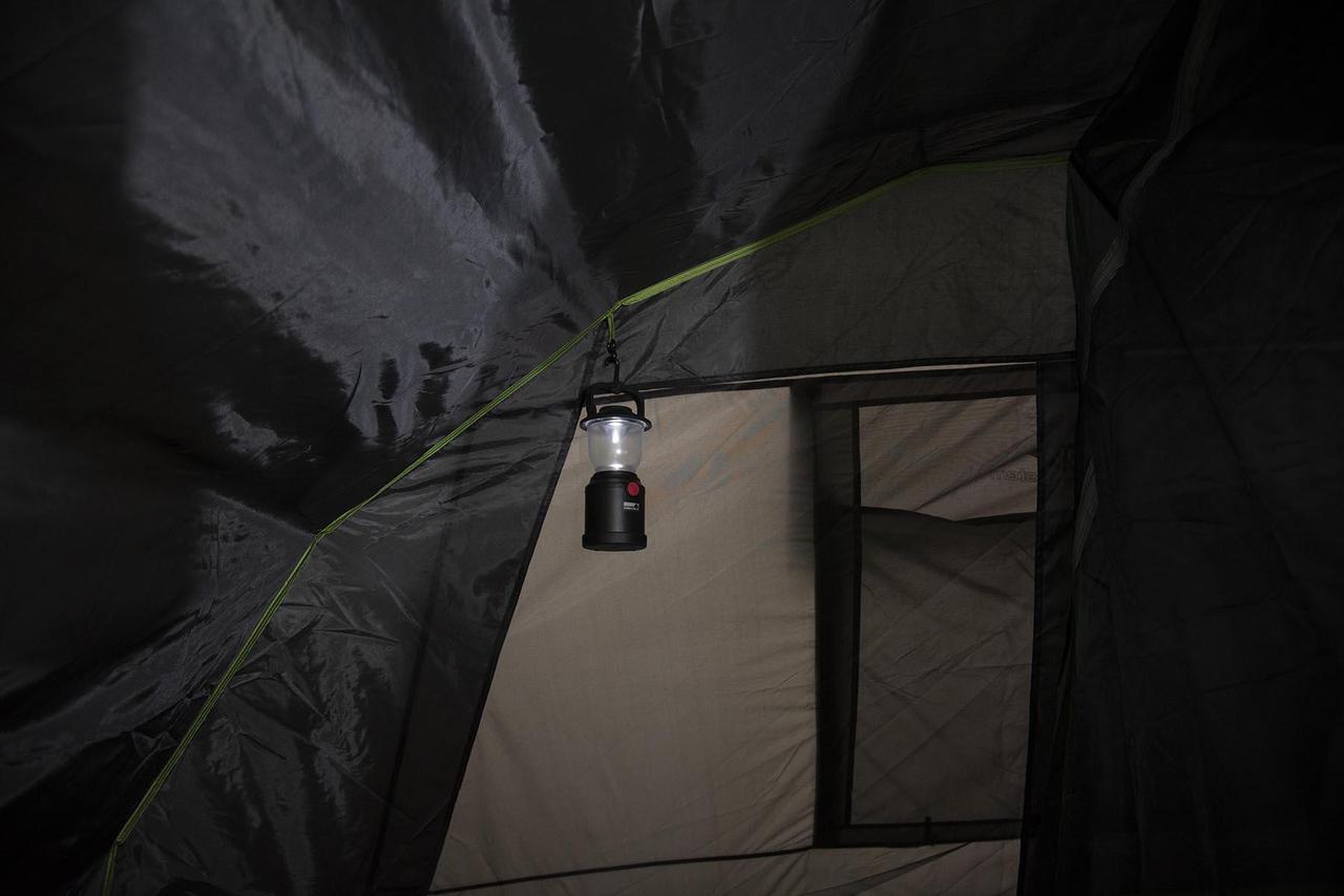 Затемнена спальня не пропускає яскраве світло, дозволяючи виспатися всім, хто пізно прокидається. Система вентиляції Vario Vent Control забезпечує регульований приплив свіжого повітря у внутрішній намет. Якщо похолодало, просто налаштуйте внутрішню заслінку. Великі двері спальні з москітною сіткою захищають від комах і покращують повітропроникність. Дверний клапан на блискавці легко регулюється зсередини і акуратно складається в зручну кишеню для зберігання. Внутрішні кишені дозволяють акуратно зберігати все необхідне. Також намет має точку кріплення для ліхтаря. High Peak Brixen 4.0 Light Grey/Dark Grey/Green (11815) - чудовий намет для відпочинку у вихідні.