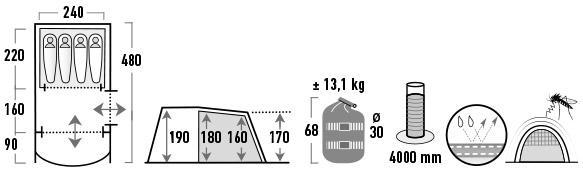 High Peak Brixen 4.0 Light Grey/Dark Grey/Green (11815) - чотиримісний тунельний намет із двома входами, вітальнею зі вшитою підлогою, що забезпечує захист від настирливих комах та небажаних протягів. Інтегрований навіс створює тінь і допомагає запобігти попаданню дощу всередину під час відчинення дверей. Житлова зона з висотою стелі 1,9 м має достатньо місця для розміщення кемпінгових стільців, столу та похідного спорядження. Сітчасте вікно зі шторою на передніх дверях забезпечує постійний приплив свіжого повітря в намет. Бічні сітчасті двері збільшують приплив свіжого повітря і захищають від комах. Прозорі вікна у житловій зоні наповнять приміщення світлом, а штори за необхідності забезпечать усамітнення. Дах має тепловідбивне алюмінізоване покриття, що знижує підвищення температури всередині намету вдень у сонячну погоду.