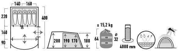 Вход на молнии позволяет проложить электрокабель внутрь палатки во время пребывания в кемпинговом лагере. Прочные стальные колышки диаметром 5 мм предназначены для твердого грунта. Проклеенные швы гарантируют прочность на разрыв и обеспечивают водонепроницаемость.