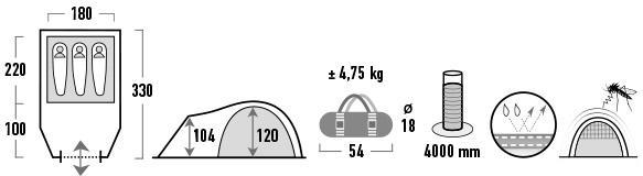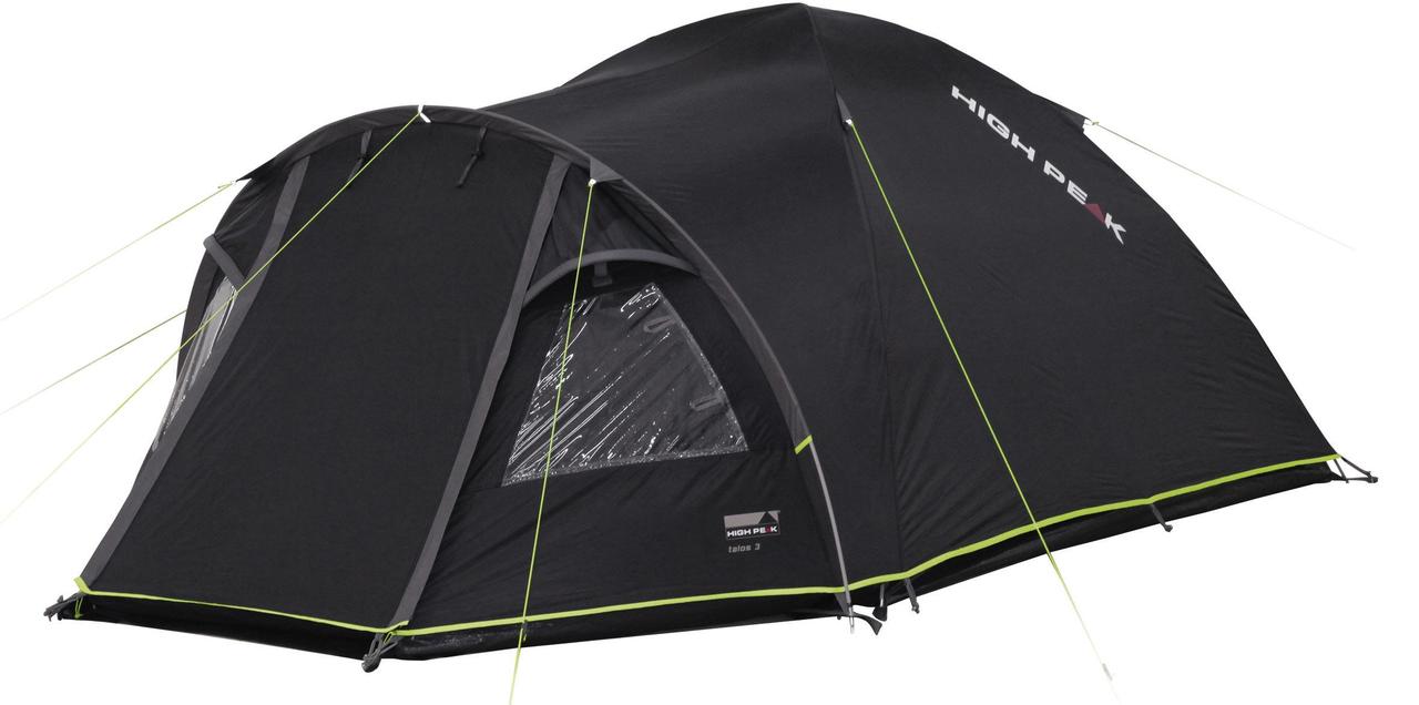High Peak Talos 3 Dark Grey/Green (11505) - тримісний намет для туристичних походів та відпочинку в кемпінговому таборі. Місткий тамбур із підлогою захищає від вогкості та призначений для зберігання спорядження. Прозорі вікна із ПВХ наповнюють світлом внутрішнє приміщення. Три регульовані вентиляційні вікна забезпечують приплив свіжого повітря, а москітна сітка на дверях в спальню позбавляє від настирливих комах.
