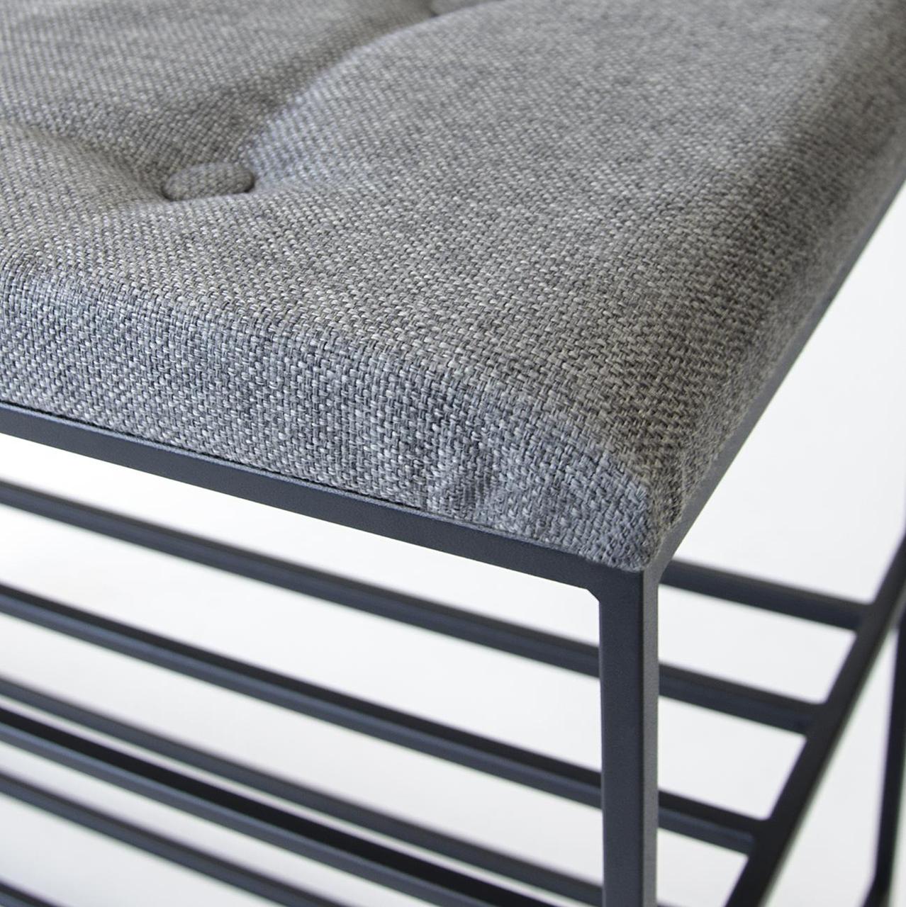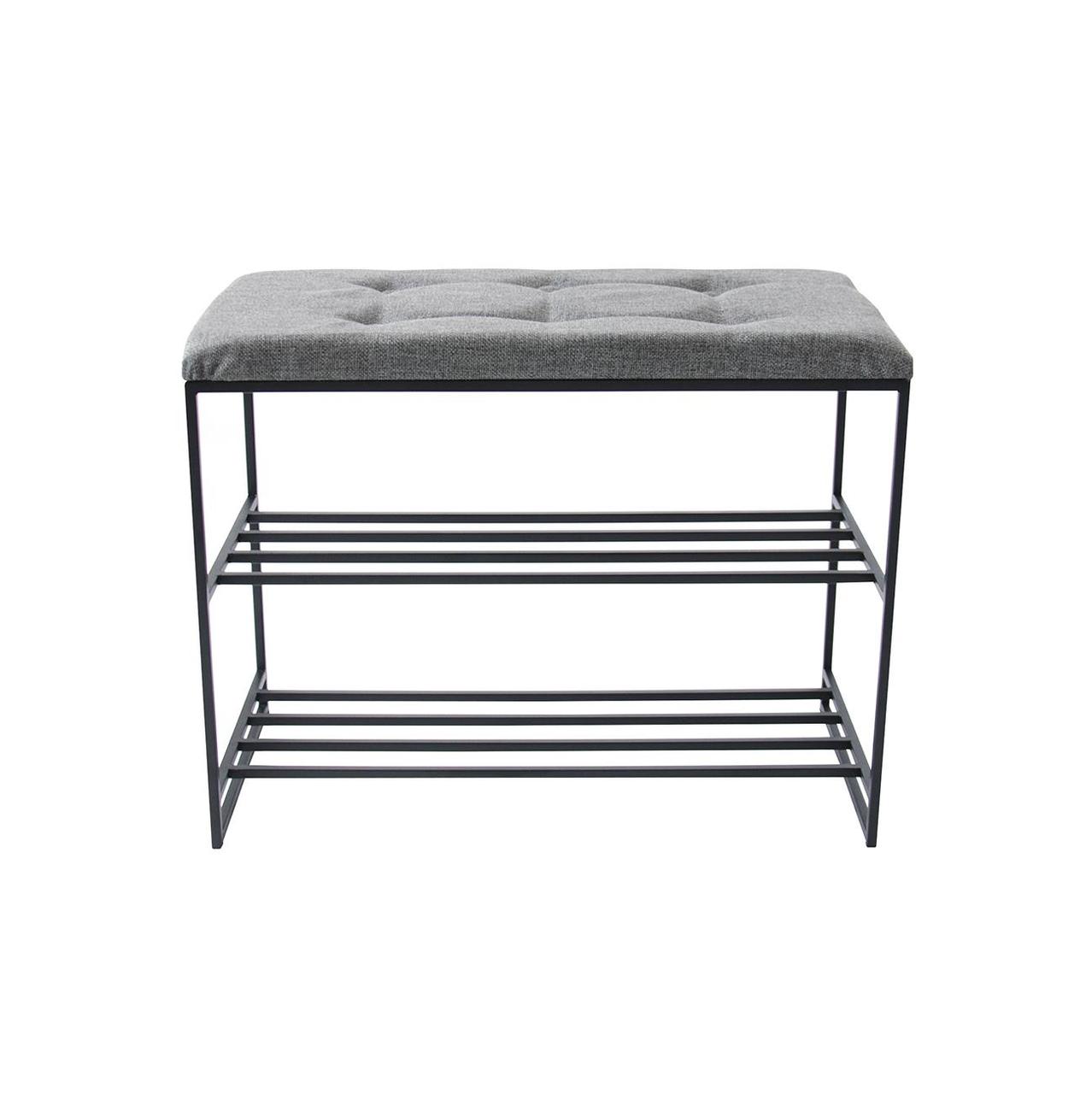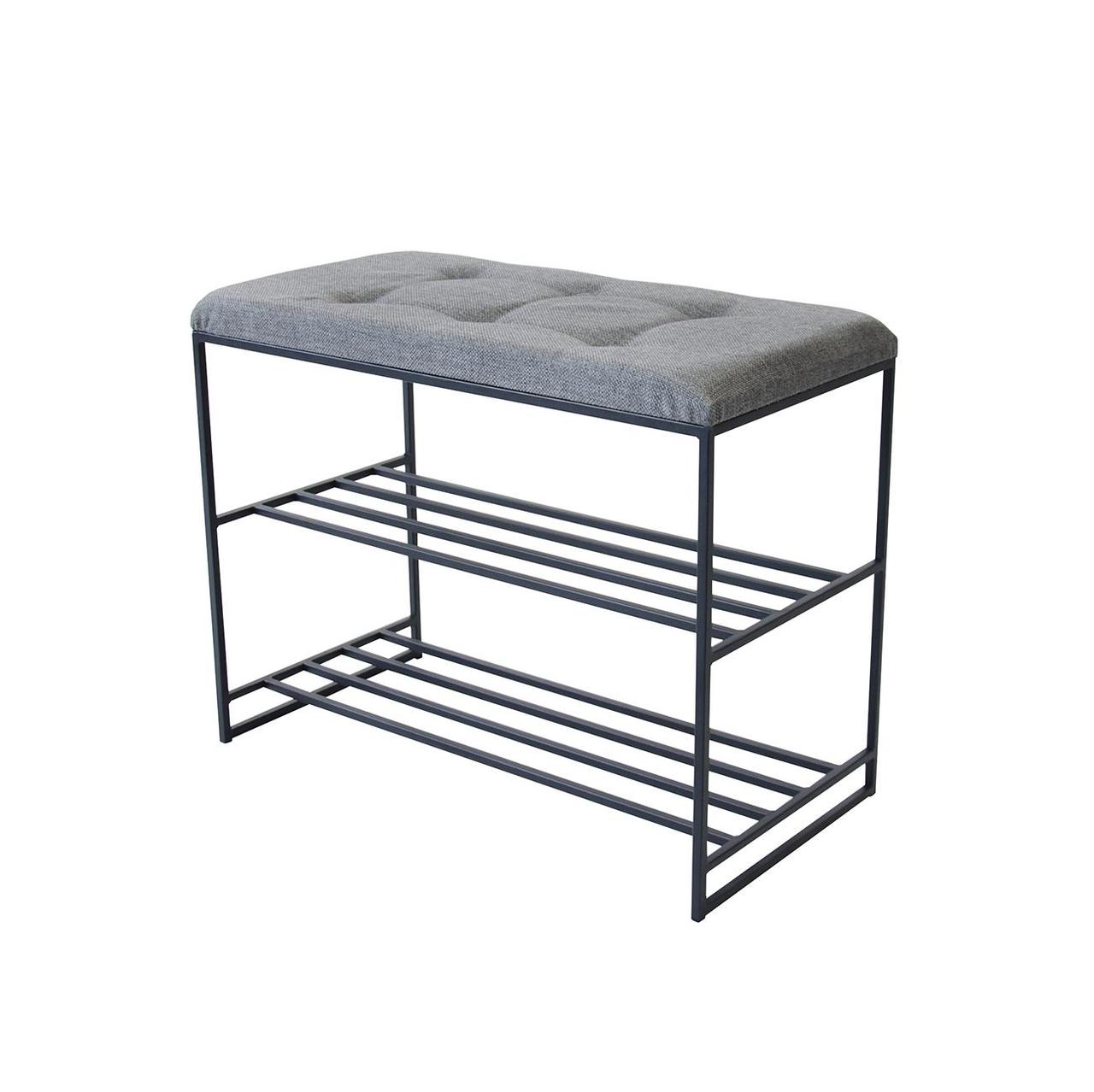 Вмістка підставка під взуття - виріб, який стане обов'язковою частиною вашої оселі. Це не лише практичний елемент для організації вашого взуття, але і стильний додаток до вашого інтер'єру. Підставка має дві металеві полиці для взуття, які виконані в кольорі графіт. М'яке сидіння можете використовувати як підставку для сумок, або як місце для сидіння. Металевий каркас конструкції дуже міцний та надійний. М'яка частина виконана в сірому кольорі тканини.