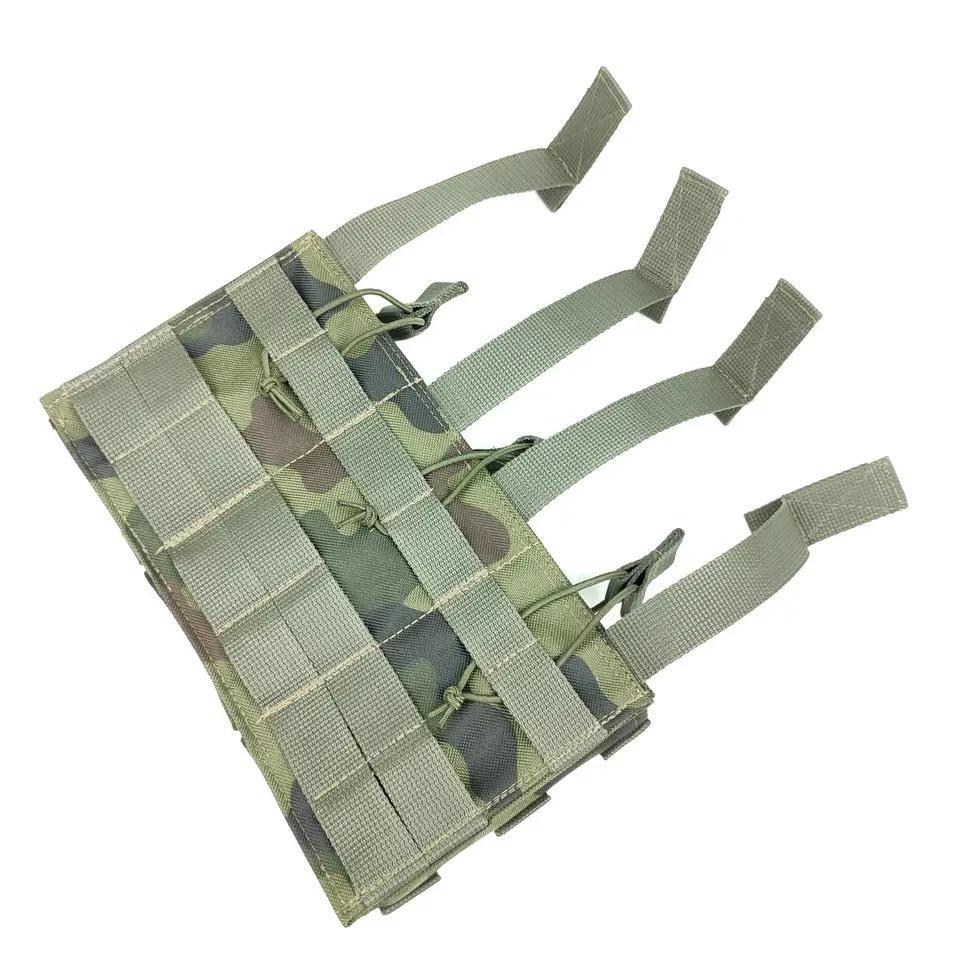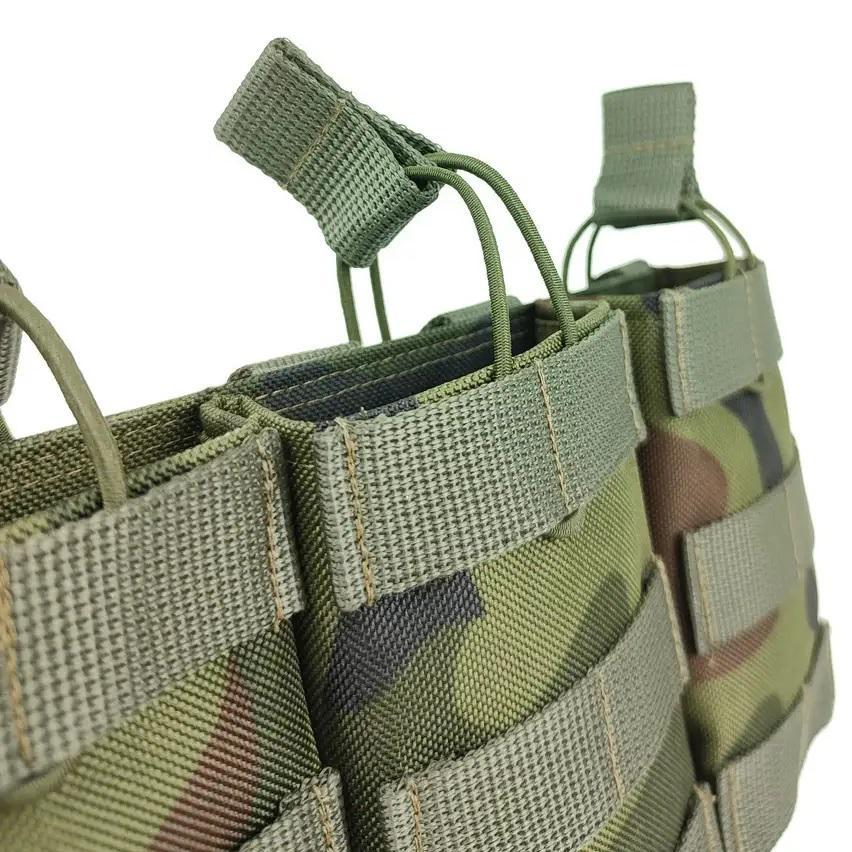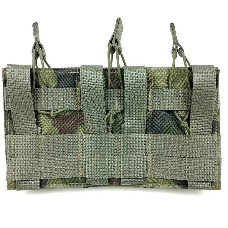 Еластичний шнур надійно фіксує та утримує магазини. Система MOLLE дозволяє кріпити підсумок з магазинами на поясі, бронежилеті та іншій екіпіровці. Міцна тканина з водовідштовхувальним покриттям дозволяє використовувати підсумок протягом всього року за будь-якої погоди. Кожний відсік можна використовувати окремо для одного магазина. На передній стінці можна додатково розмістити інші MOLLE-сумісні елементи. Дно підсумка оснащене люверсами для стоку води. Призначений для перенесення на спорядженні у відкритому вигляді 3-х автоматних магазинів. Розмір – 23х12,5х2 см. Тканина – Оксфорд 600D. Колір – мультикам. Вага – 140 г. Країна виробник – Україна.