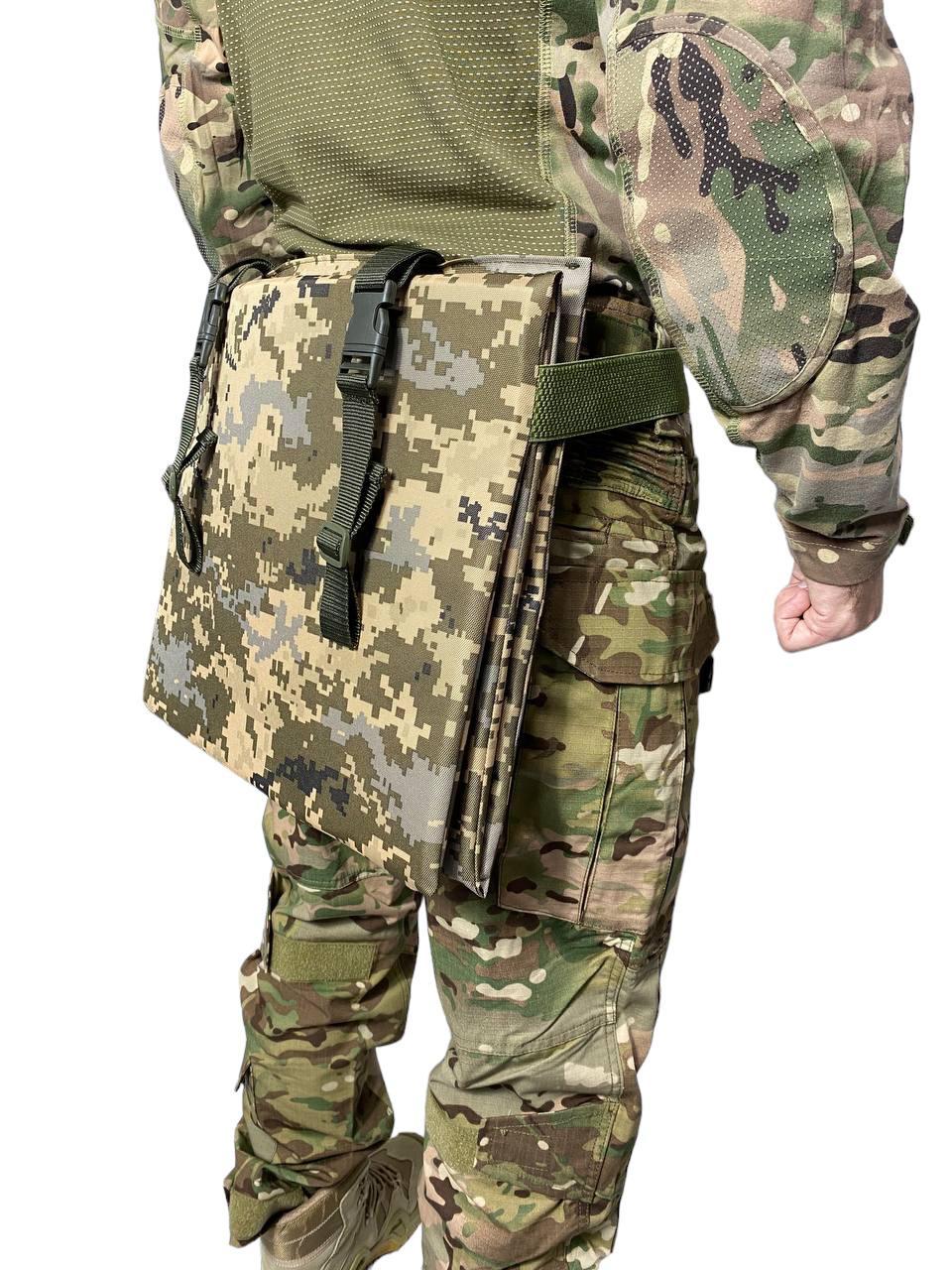 Потрійний тактичний каремат Ranger. Килим-трансформер, що складається з 3-х секцій. В складеному вигляді фіксується на липучці для запобігання розгортання. Вдягли на себе та вільно пересуваєтесь, а під час привалу розкладається аби була змога полежати та відпочити повноцінно. Невеликі розміри та можливість використовувати в трьох різних положеннях роблять його універсальним і незамінним у польових умовах. Присутні два види кріплення: резинка на фастекси для кріплення на пояс, та стропа з силовою кнопкою для крипленя на ремінь або РПС. Дуже зручно кріпиться за допомогою гумки з карабіном, регулюється довжина. Можете сміливо сідати на будь-яку поверхню! Ця сидіння захистить від холоду та вологи, не рівної поверхні та вад грунту. Завдяки тому що килимок має наповнювач Ви будете захищені від преохолодження. Розмір в розкладеному вигляді: 40х100х1 см; Розмір в складеному вигляді: 40х36х3 см; Товщина: 10 мм; Система кріплення: система моллі + система швидкого зняття, кріплення на поясі резинкою + фастекс Матеріал зовнішній: Оксфорд 600D PU (водовідштовхуючий); Матеріал внутрішній: Ізолон; Колір: піксель.