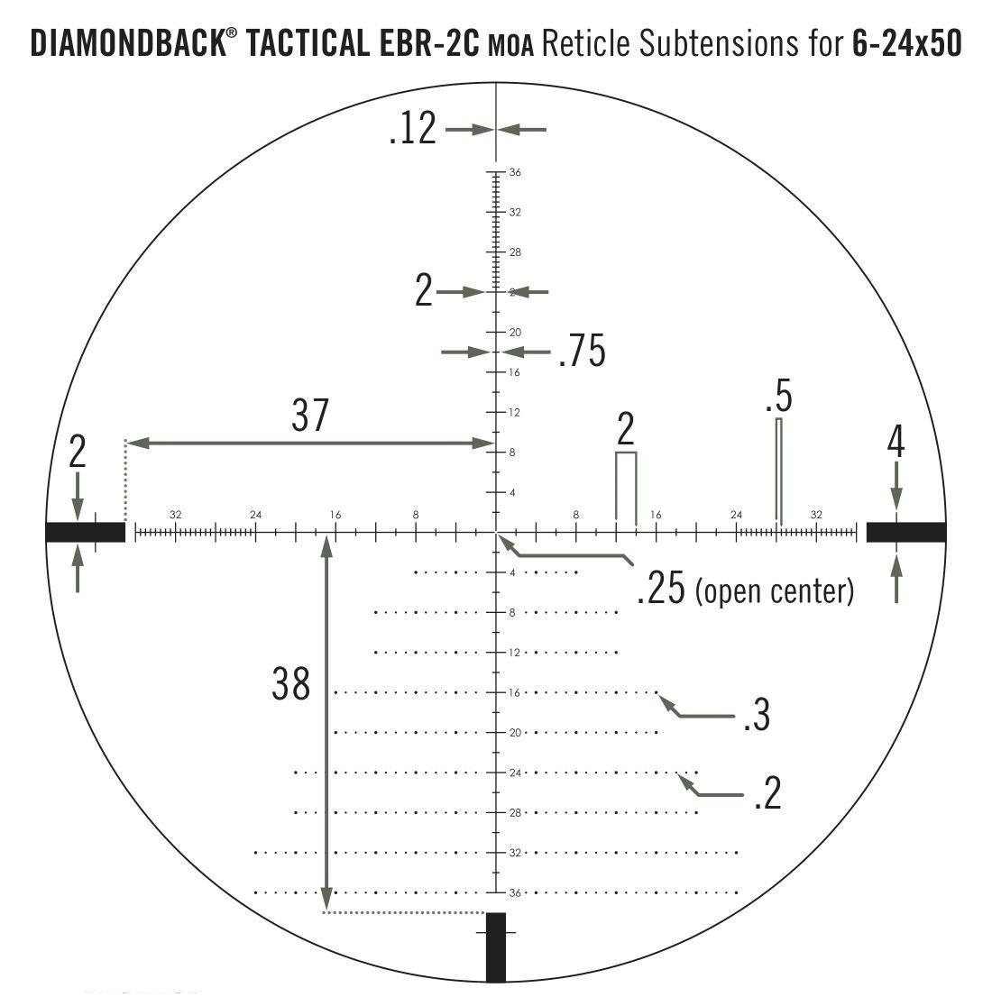 Оптичний приціл Vortex Diamonback Tactical 6-24x50 з прицільною маркою EBR-2C (в кутових хвилинах), розташованої у фокальній площині об'єктива.