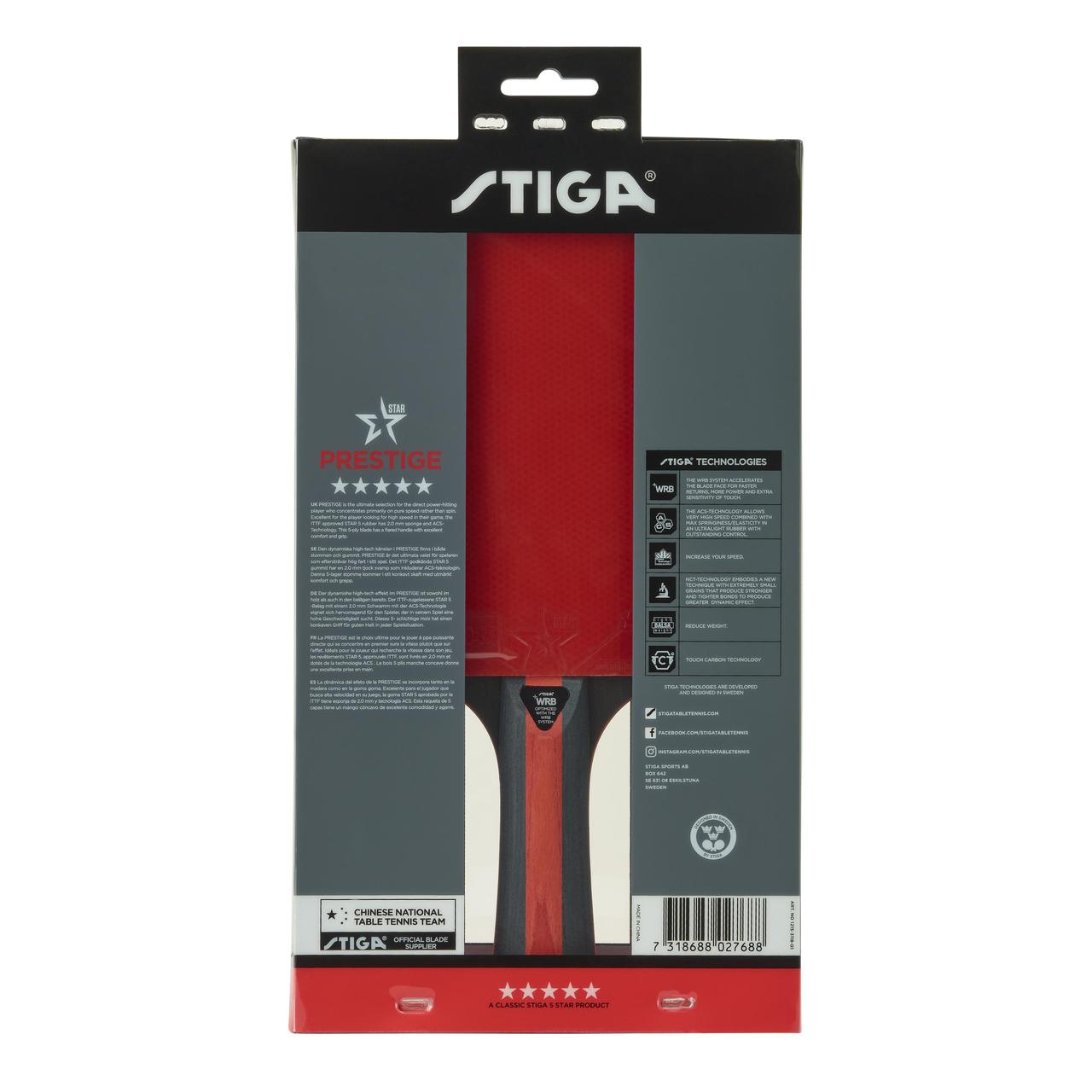 Ракетка для настільного тенісу Stiga Prestige - це п'ятизіркова швидкісна ракетка найвищої якості, розроблена виключно для потужних атакувальних гравців зі швидким і жорстким стилем гри. Завдяки гумі Star 5 - 2.00 мм, ракетка збільшує силу удару і швидкість удару по м'ячу. Ракетка має чудові технології від майстерні Stiga: WRB, ACS і Crystal Technology. Ракетка сертифікована Міжнародною федерацією настільного тенісу ITTF.