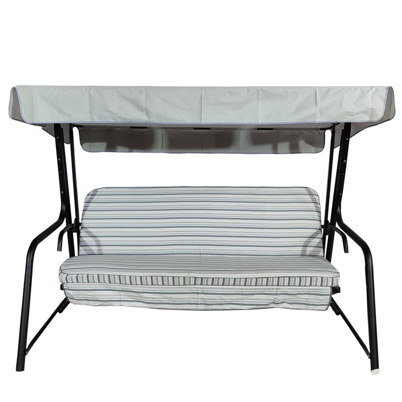 Кут нахилу тенту (нахил вгору-вниз) регулюється бічними фіксаторами на даху. Гойдалка комплектується: матрацом, тканинним тентом. Оббивка матраца, тент і подушки виготовлені з тканини тексілк. Ця тканина спеціально розроблена для вуличних меблів і має такі переваги: