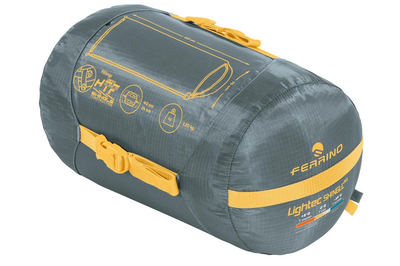 Серія ультралегких спальних мішків Ferrino Lightec має мінімальні розміри при упаковці в компресійний чохол, але при цьому відмінно підходить навіть для користувачів зростом більше 2 метрів. Ferrino Lightec Shingle SQ є найлегшим та компактним синтетичним спальником прямокутної форми серед моделей із подібним рівнем теплоізоляції. Незважаючи на те, що дана модель позиціонується як трисезонний спальник, але якщо в пріоритеті стоїть економія місця в рюкзаку, то спальний мішок можна використовувати і в зимових походах, завдяки значному запасу за екстремальною температурою. Матеріал наповнювача HTF Compact має визначне співвідношення ваги і термоізоляційних властивостей. Блискавка розстібається як ззовні, так і зсередини, має утеплювальний борт та стропу проти защемлення тканини у замку.
