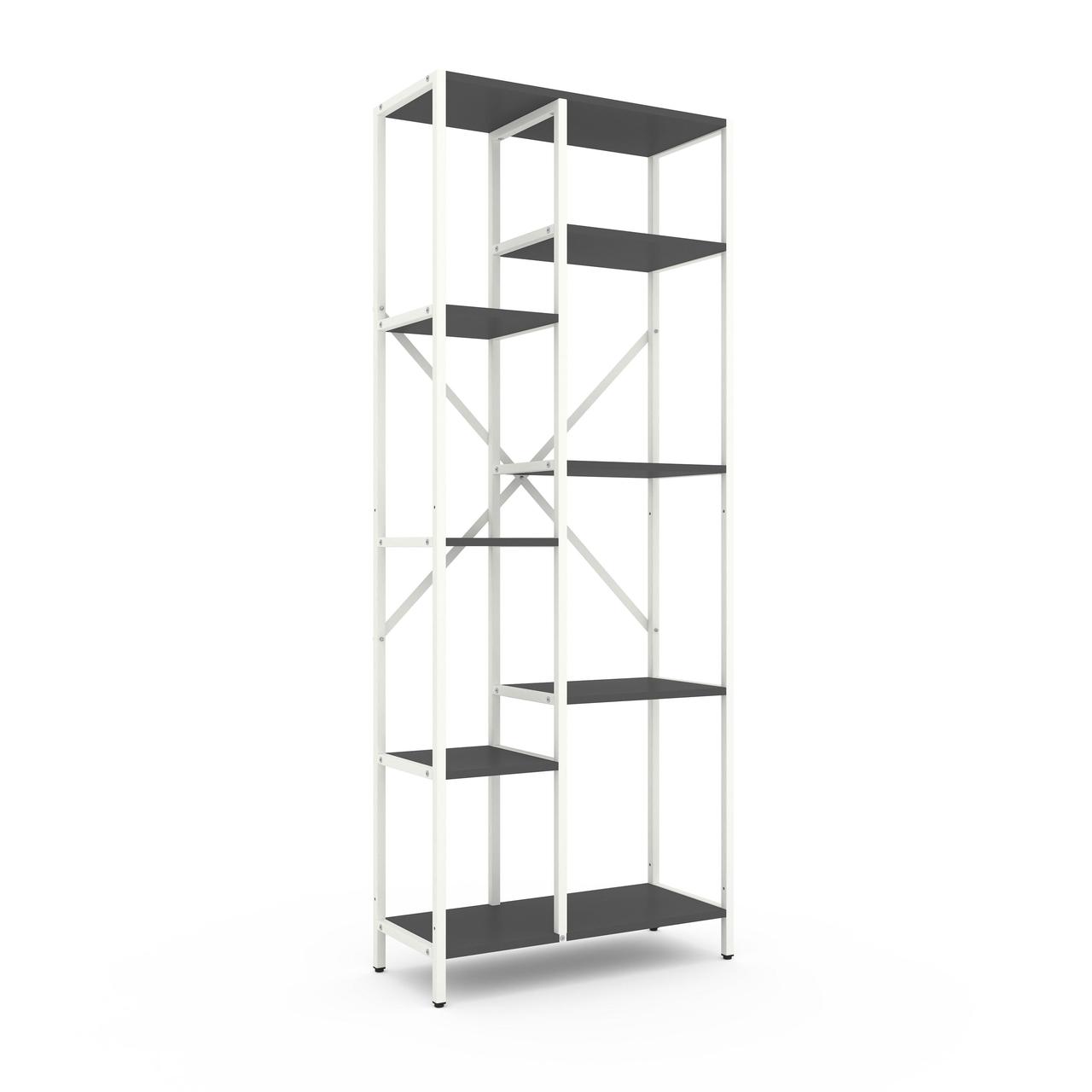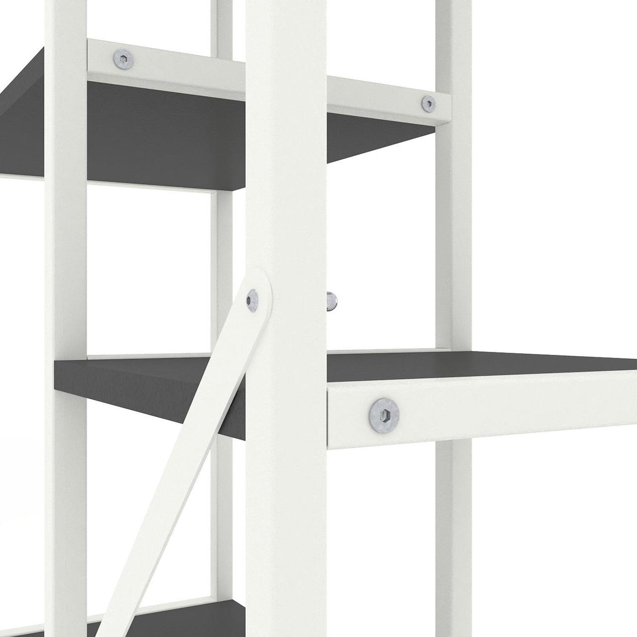 Модель доступна у двох варіантах каркаса: Білий або Антрацит. Полиці можна вибрати у відтінках, які часто застосовуються як базові в лофт-дизайні.