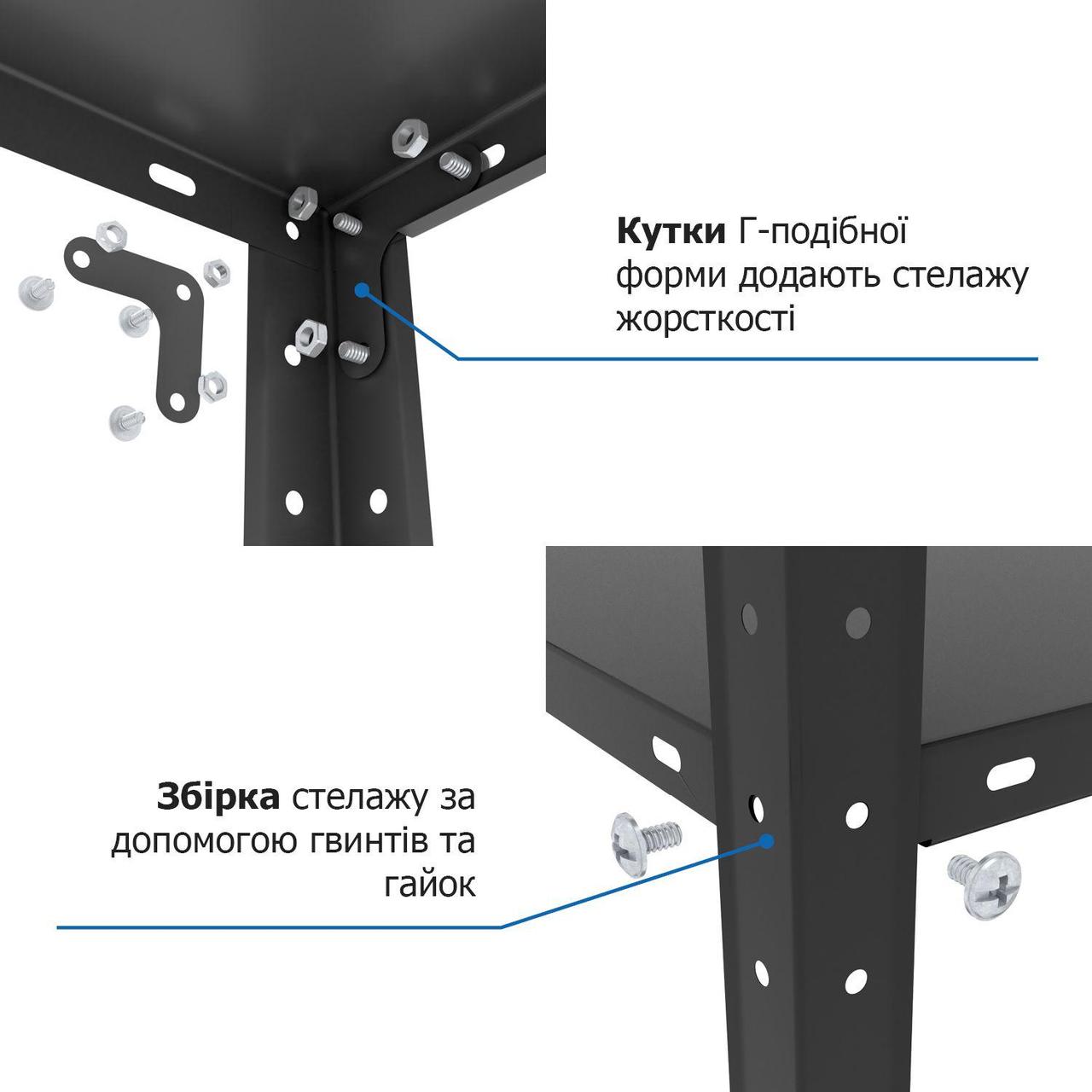 • Полиці стелажу кріпляться на болтах, що полегшує та прискорює процес складання (15-30 хв).