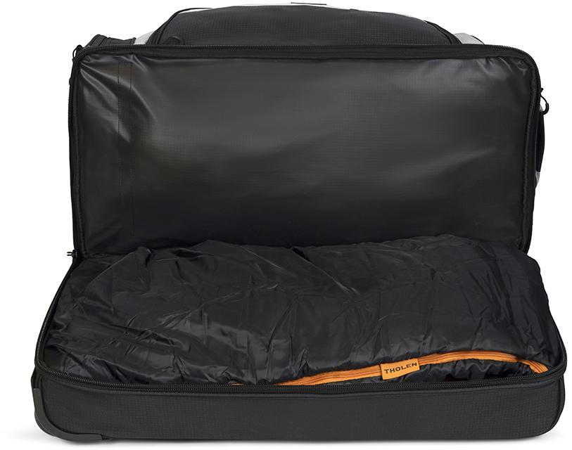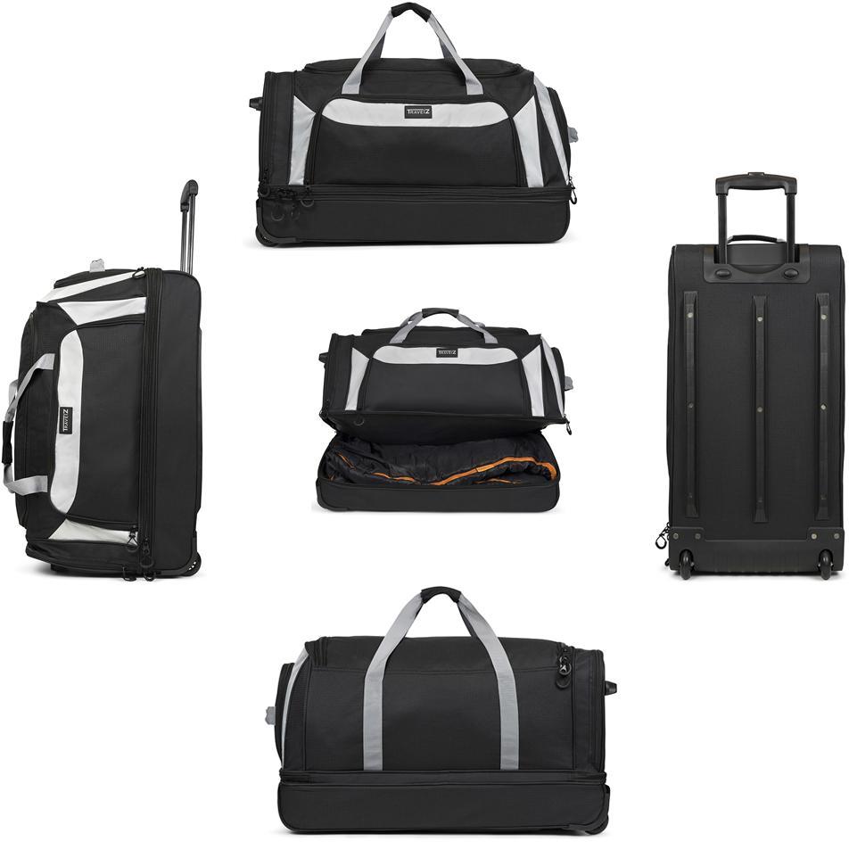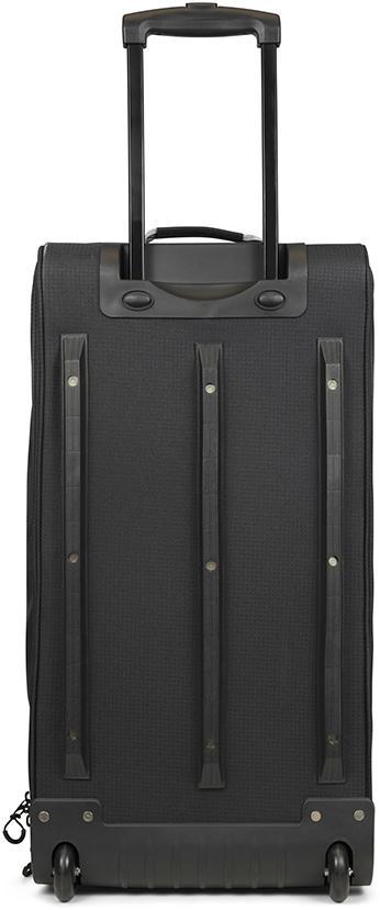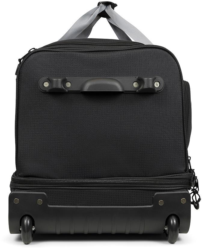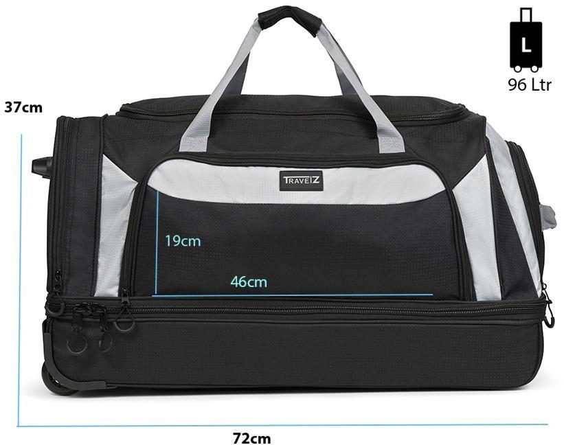 Сумка дорожня на колесах TravelZ Wheelbag Doubleloader black 96L (603098) - дорожня сумка з м яким корпусом, на колесах, об'ємом 96 літрів із телескопічною ручкою. Завдяки двом містким боковим кишеням і великому основному відділенню з U-подібним отвором цю сумку зручно використовувати, а її об'єм не поступається великій валізі. Велике нижнє відділення об'ємом близько 25 літрів можливо використовувати для взуття. Якщо сумка заповнена речами, то вона може стояти вертикально, завдяки спеціальній підставці з лівого боку. Ручки по обидва боки дозволяють легко підійняти сумку. Утоплені колеса вбудовані в тверду опорну пластину з протекторами. Висувна ручка регулюється у двох положеннях до 95 см і це зручно для людей високого зросту.