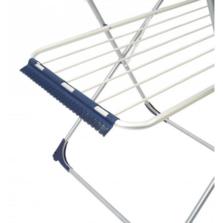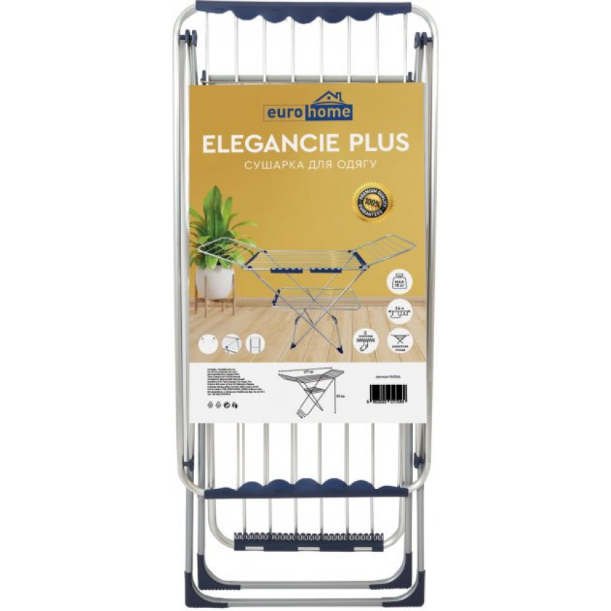Cушка для білизни Elegancie Plus 24 м ідеально підходить для використання в невеликих приміщеннях. Вона замінює 24 м мотузки для білизни, економить простір і забезпечує якісне і швидке висихання речей. Сушіння виконане з алюмінію з темно-синіми пластиковими елементами, підійде до будь-якого інтер'єру. Конструкцію можна використовувати вдома та на дачі. Конструкція складається з декількох елементів: з боків корпусу розміщені стулки або крила, які розкладаються в різні боки, а знизу є додатковий ярус для розвішування речей невеликого розміру, що збільшує робочу поверхню сушіння Elegancie Plus до 24 м.