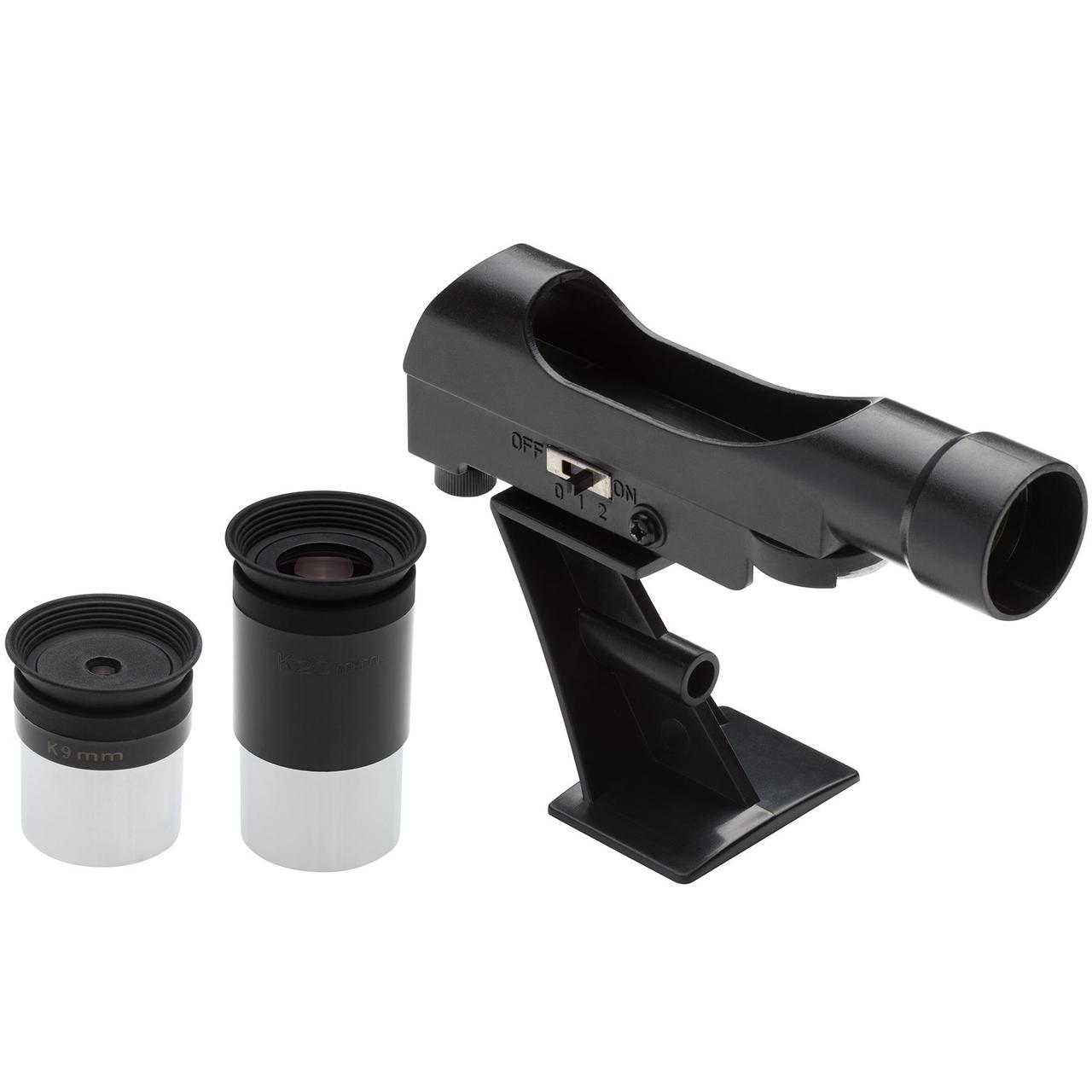 У комплектацію входить адаптер для смартфона (планшета). Адаптер крепится на выбранном окуляре и позволяет проводить фото и видеосъемку главной или передней камерой гаджета. Гладкая тыльная сторона смартфона надежно крепится с помощью множества присосок адаптера (при рифленой тыльной поверхности смартфона рекомендуется использовать переднюю камеру). Набор аксессуаров облегчит наблюдение и сделает их более интересными и подробными. В комплектацию кроме адаптера для камеры смартфона (планшета) входят два очка, поворотная карта звездного неба и программное обеспечение.