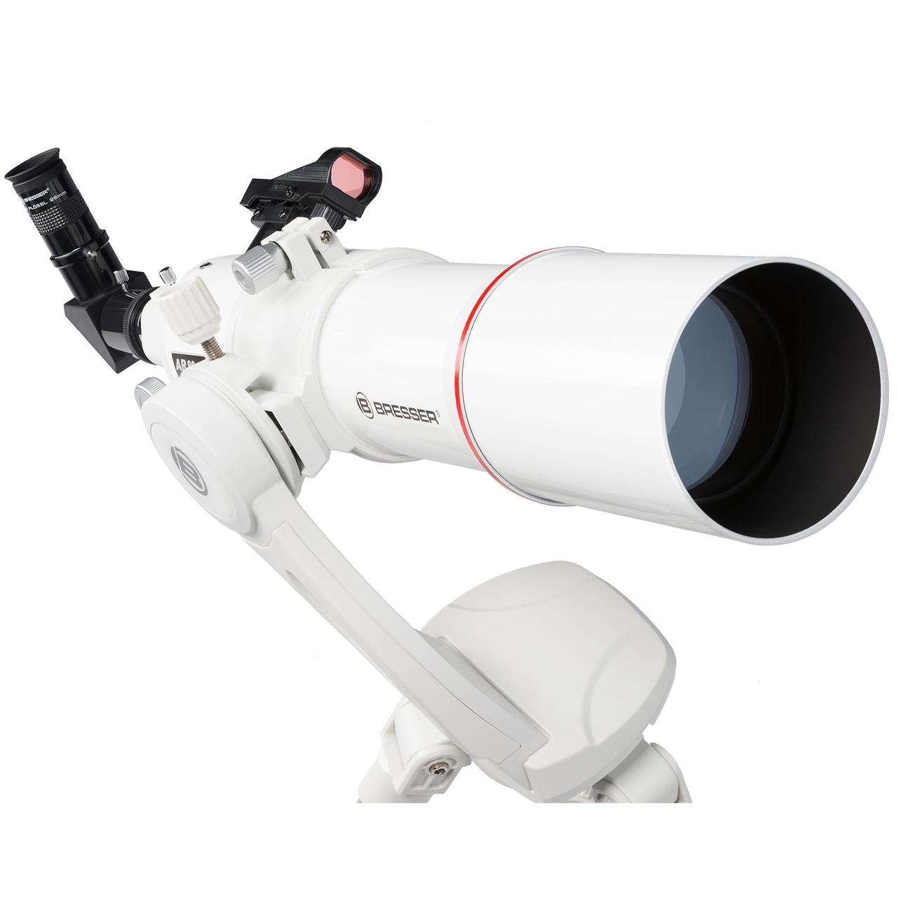 Ця модель отримала оновлення у вигляді сонячного фільтра і тепер може бути використана для денних спостережень сонячної активності. Телескоп Bresser Nano AR-80/640 Nano AZ являє собою короткофокусний середньоапертурний рефрактор з якісною оптикою і новим азимутальним монтуванням Nano AZ, зручним для роботи з легкими трубами середньої апертури. Телескоп буде дуже цікавий для користувачів-початківців, оскільки має ідеальний баланс між світлосилою і можливістю отримати достатнє збільшення при роботі з якісним базовим окуляром. Модель відмінно підходить для спостереження за об'єктами Сонячної системи, а також для наземних спостережень. Телескоп поставляється практично зібраним і з необхідним набором аксесуарів для негайного старту спостережень. Телескоп дуже стійкий, тому що поставляється в комплекті зі сталевим монтуванням. Цікавим аксесуаром у комплектації є адаптер для смартфона, за допомогою якого легко фотографувати об'єкти спостережень на камеру вашого смартфона.