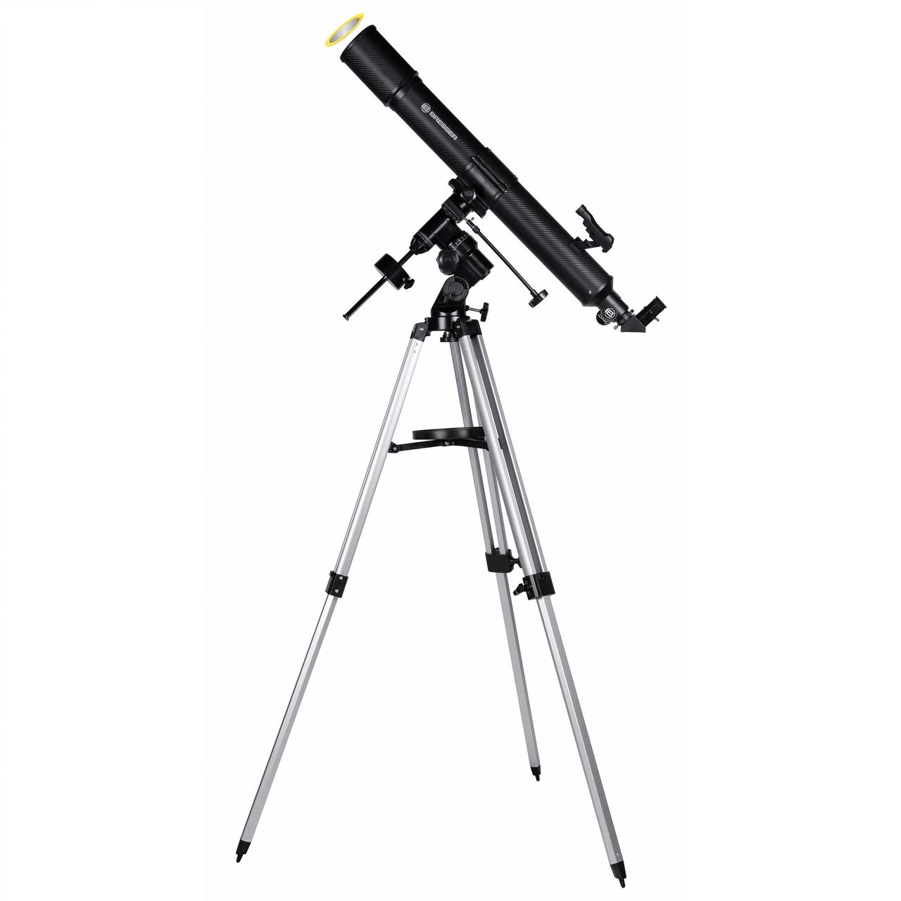 Bresser Refractor Quasar 80/900 EQ Solar чудова модель телескопа для охочих заглибитися не тільки в деталі нічного неба, але й спостерігати за активністю Сонця завдяки наявності в комплектації апертурного сонячного фільтра. 80-мм об'єктив (скла ВАК-4) дозволяє зібрати на 77% більше світла, ніж 60-мм рефрактори. Телескоп встановлений на екваторіальному монтуванні, яке призначене спеціально для астрономічних спостережень і дозволяє компенсувати добове обертання небесної сфери поворотом телескопа лише в одній площині. Основними відмінностями від попередньої версії є полегшена алюмінієва тринога з шестикутним профілем, карбонове оздоблення труби, збільшення зі штатними аксесуарами та адаптер для камери смартфона. За допомогою адаптера для смартфона, що йде в комплекті з телескопом, легко фотографувати спостереження на камеру вашого смартфона. Опціонально телескоп може бути пов'язаний з PC-окуляром для запису та редагування зображень та відеороликів нічного неба.