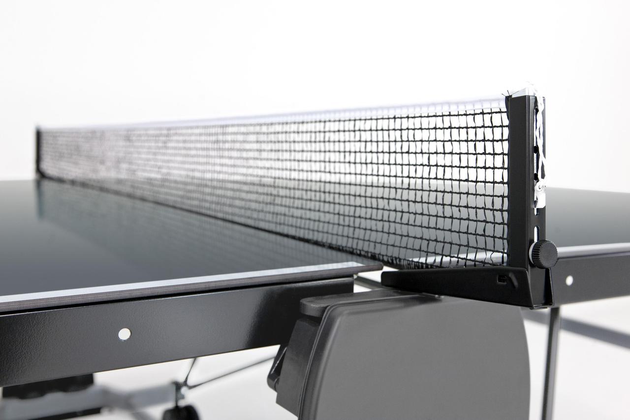 Garlando Performance Outdoor 4 mm Grey (C-380E) - всепогодний тенісний стіл, призначений для гри в настільний теніс як на вулиці, так і в закритих приміщеннях. Ігрова поверхня виконана з меламінових плит товщиною 4 мм із металевою крайкою по периметру. Модель надзвичайно стійка, завдяки конструкції з ніжками з металевих трубок діаметром 40 мм і горизонтальним з’єднувальним планкам. Чотири здвоєні транспортувальні колеса діаметром 128 мм обертаються на 360°, що суттєво полегшує переміщення столу за потреби. Тенісний стіл оснащений сіткою та тримачем для ракеток і м'ячів. Компактний пристрій автоматичного закривання мінімізує обтяження після того, як настільний стіл складено, а система ECS дозволяє розблокувати стільниці одним рухом максимально швидко та безпечно. Складана конструкція з автоматичною системою блокування забезпечує зручне зберігання столу в домашніх умовах. Піднявши одну з половинок стільниці, тенісний стіл можна використовувати як для одиночних тренувань, так і для гри людьми з обмеженими можливостями. Стільниця забезпечує хороший відскік м'яча, а покриття антивідблиску дозволяє грати довше, не напружуючи очей. Тенісний стіл Garlando Performance Outdoor 4 mm Grey (C-380E) відповідає Європейським стандартам безпеки EN 14468-1/2, рекомендований для інтенсивного використання в школах і клубах.