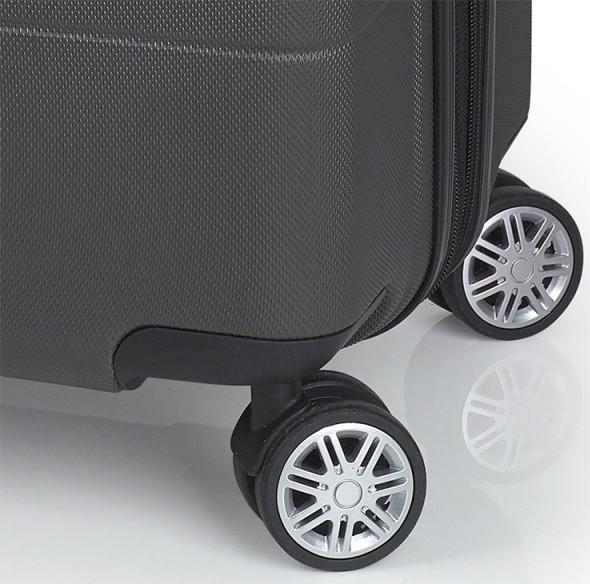 Валіза оснащена чотирма колесами з можливістю незалежного розвороту кожного колеса на 360°. Система передбачає рівномірний перерозподіл навантаження на кожне колесо, що своєю чергою сприяє плавному руху та маневреності валізи, докладаючи при цьому мінімум зусиль. Колеса виготовлені з високотемпературного термопластичного поліуретану (TPU). Відмінною особливістю коліс із TPU матеріалу є зниження шуму до мінімуму під час руху валізи нерівною поверхнею. Завдяки стійкості до стирання, матеріал коліс відрізняється тривалим терміном експлуатації.
