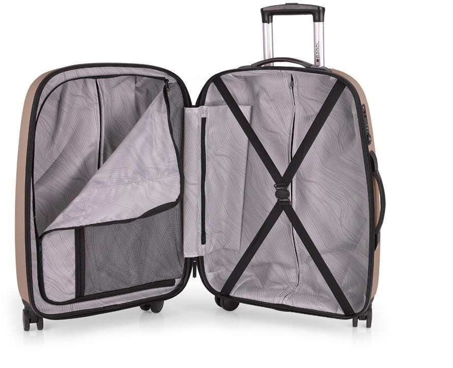 Корпус валіз Gabol серії Paradise XP виконаний з легкого та водночас міцного матеріалу ABS - термопластичний листовий конструкційний матеріал, який має підвищену ударостійкість і пружність, що дуже важливо для валіз які перевозяться в багажних відділеннях. Внутрішній простір розділений перегородкою на два відділення, яка має сітчасту кишеню на блискавці, додатково є кишеня для документів або різних дрібниць. Валіза обладнана розширювальним клапаном, який за необхідності дозволяє збільшити об'єм до 112 літрів.