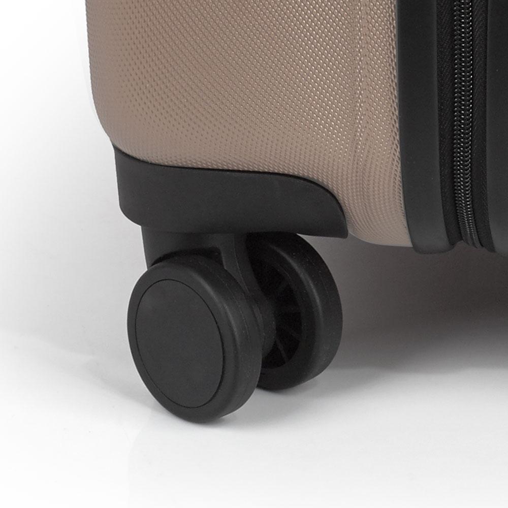 Валіза Gabol Paradise XP (L) Beige (123347-006) оснащена чотирма здвоєними колесами з можливістю незалежного розвороту на 360°. Конструкцією передбачений рівномірний розподіл навантаження на кожне колесо, що в свою чергу сприяє плавному руху та маневреності валізи, докладаючи при цьому мінімум зусиль. Колеса виготовлені з високотемпературного термопластичного поліуретану (TPU). Даний матеріал має міцність порівнянну з пластиком, гнучкість силікону, а також підвищену стійкість до перепадів температури. Відмінною особливістю коліс із TPU є зниження шуму до мінімуму під час руху валізи. Завдяки стійкості до стирання, матеріал коліс відрізняється тривалим терміном експлуатації.