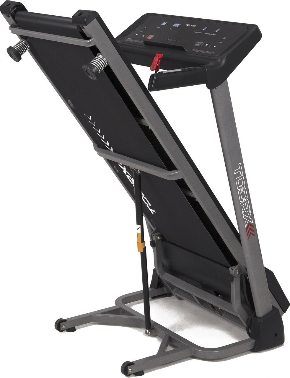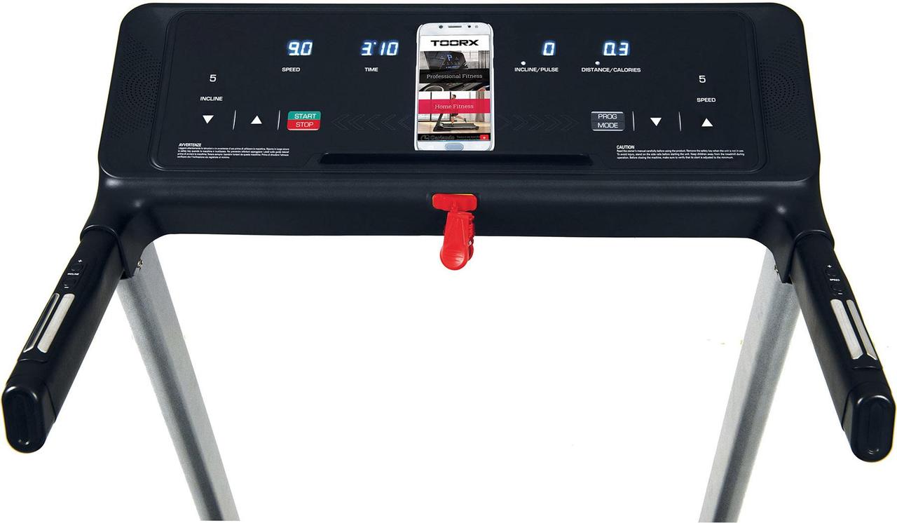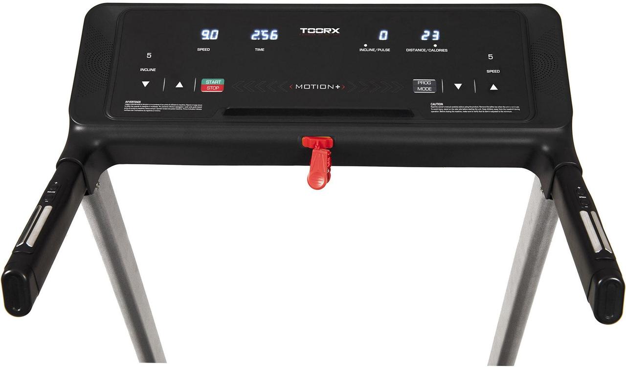 Бігова доріжка Toorx Treadmill Motion Plus (MOTION-PLUS) від італійського виробника Garlando S.p.A. призначена для спортивної ходьби та бігу в домашніх умовах. Модель розрахована на максимальну вагу користувача до 100 кг і має двигун постійного струму 1,75 к.с., який дозволяє розвивати швидкість від 0,8 до 14 км/год. Бігове полотно розміром 121 х 40 см із можливістю регулювання нахилу від 0 до 12% як кнопками на консолі тренажера, так і за допомогою кнопок, розташованих на поручнях. Система амортизації Spring Absorption знижує навантаження на суглоби та мінімізує ризик отримання травми в процесі занять. Консоль тренажера з LED-дисплеєм оснащена програмами для користувачів із різними рівнями підготовки. Вбудовані сенсорні датчики вимірювання пульсу будуть доречними під час тренування для контролю частоти серцевих скорочень. Бігова доріжка Toorx Treadmill Motion Plus (MOTION-PLUS) має попередньо зібрану раму та транспортувальні ролики, завдяки чому її легко переміщати по квартирі.