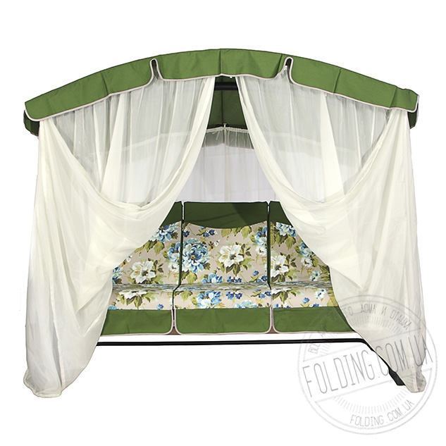Стальная труба толщиной 50 мм., из которой изготовлен каркас качелей, от коррозии надежно предохраняется полимерным покрытием. Ткань, из которой пошиты тент и съемные чехлы спинки и сидения, 100% хлопок с тефлоновой пропиткой для большей защиты от дождя. Наполнителем для матрасов служит поролон 10 см. толщиной.