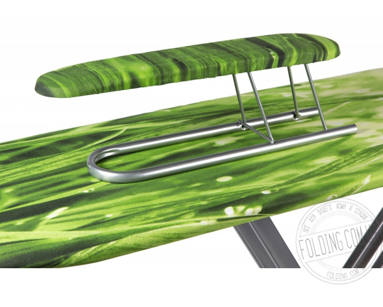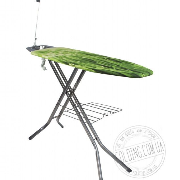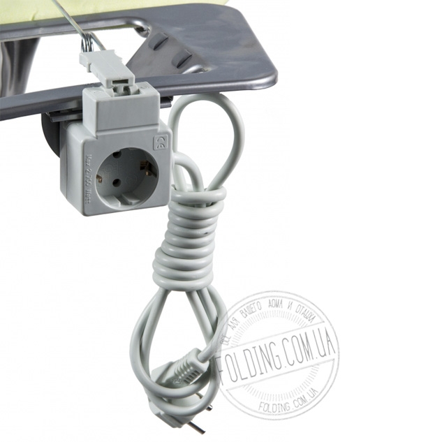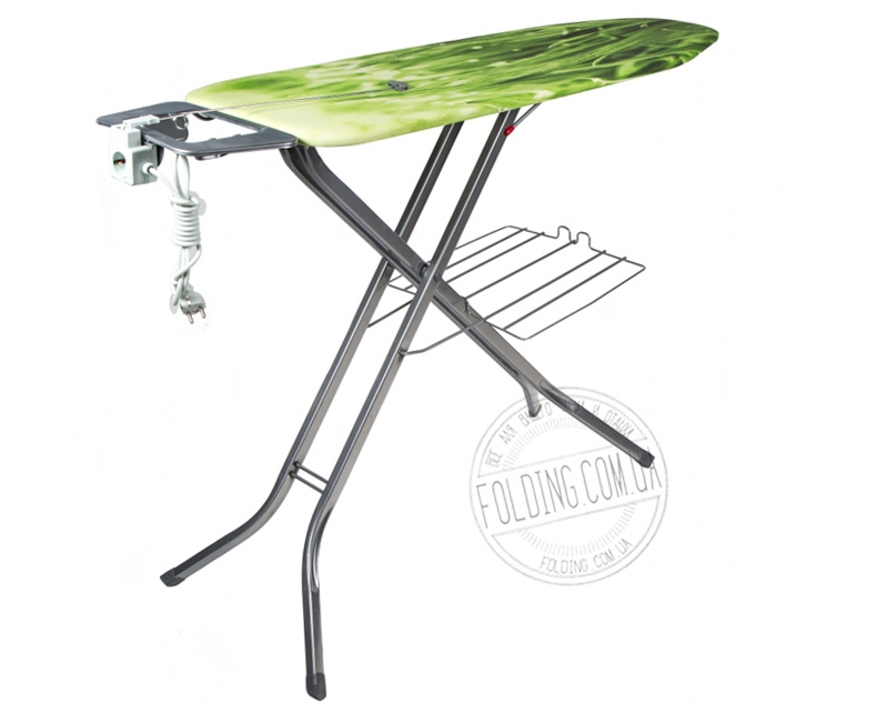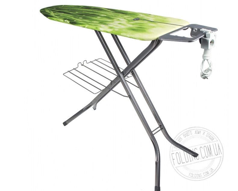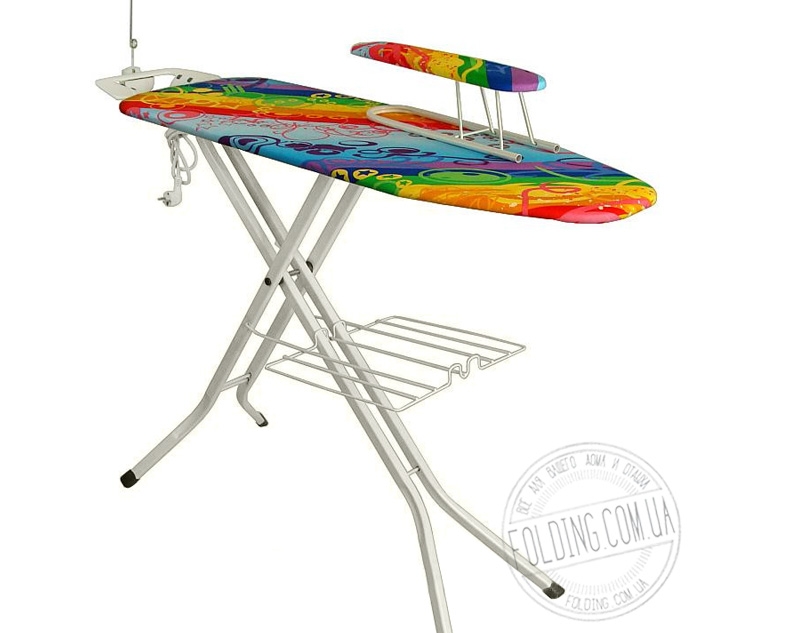 Доска укомплектована абсолютно всеми аксессуарами для глажки белья в любых условиях. Данная модель доски идет в комплекте со складным подрукавником, полочкой для белья, розеткой с удлинителем и держателем шнура утюга.
