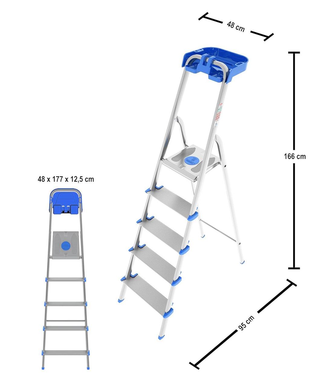 Драбина Colombo Atlantica 5 щаблів (S112A05P). Це 100% алюмінієва драбина, що сертифікована відповідно до стандарту EN131. Загальна вага, яку витримує драбина 150 кілограмів. У комплекті з драбиною міцний лоток для інструменту, за допомогою якого можна кріпити та утримувати на висоті потрібні користувачеві інструменти при використанні драбини. Він витримує вагу до 5 кг. У вас завжди буде все необхідне для швидкої роботи. Великі алюмінієві щаблі мають глибину 12 см. Нековзка поверхня забезпечує підйом і спуск без ковзання. Механізм безпеки запобігає випадковому закриванню під час використання. Компактний розмір дозволяє легко зберігати, займаючи мінімальний простір.