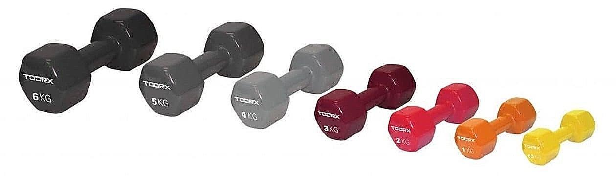 Гантелі для фітнесу Toorx Vinyl доступні у широкому діапазоні ваг від 0,5 до 6 кг для задоволення різних потреб тренувань.