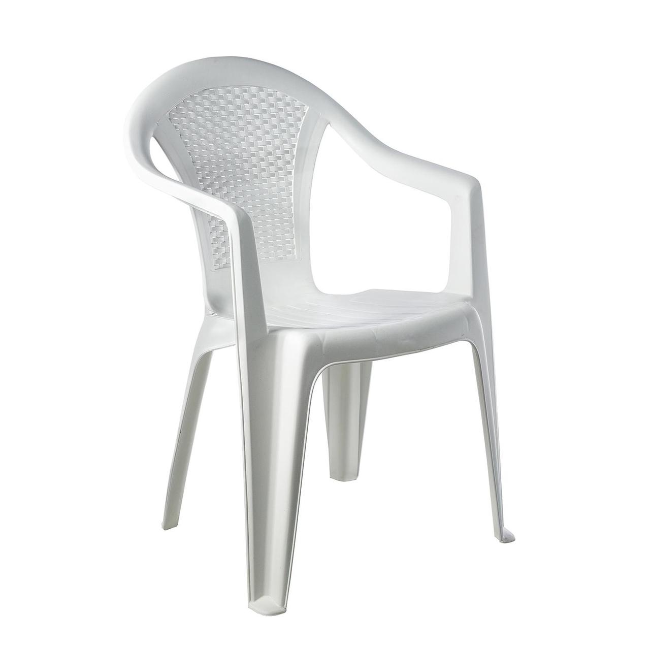 Вуличне пластикове крісло з декором спинки, який імітує плеттіння ротанга.