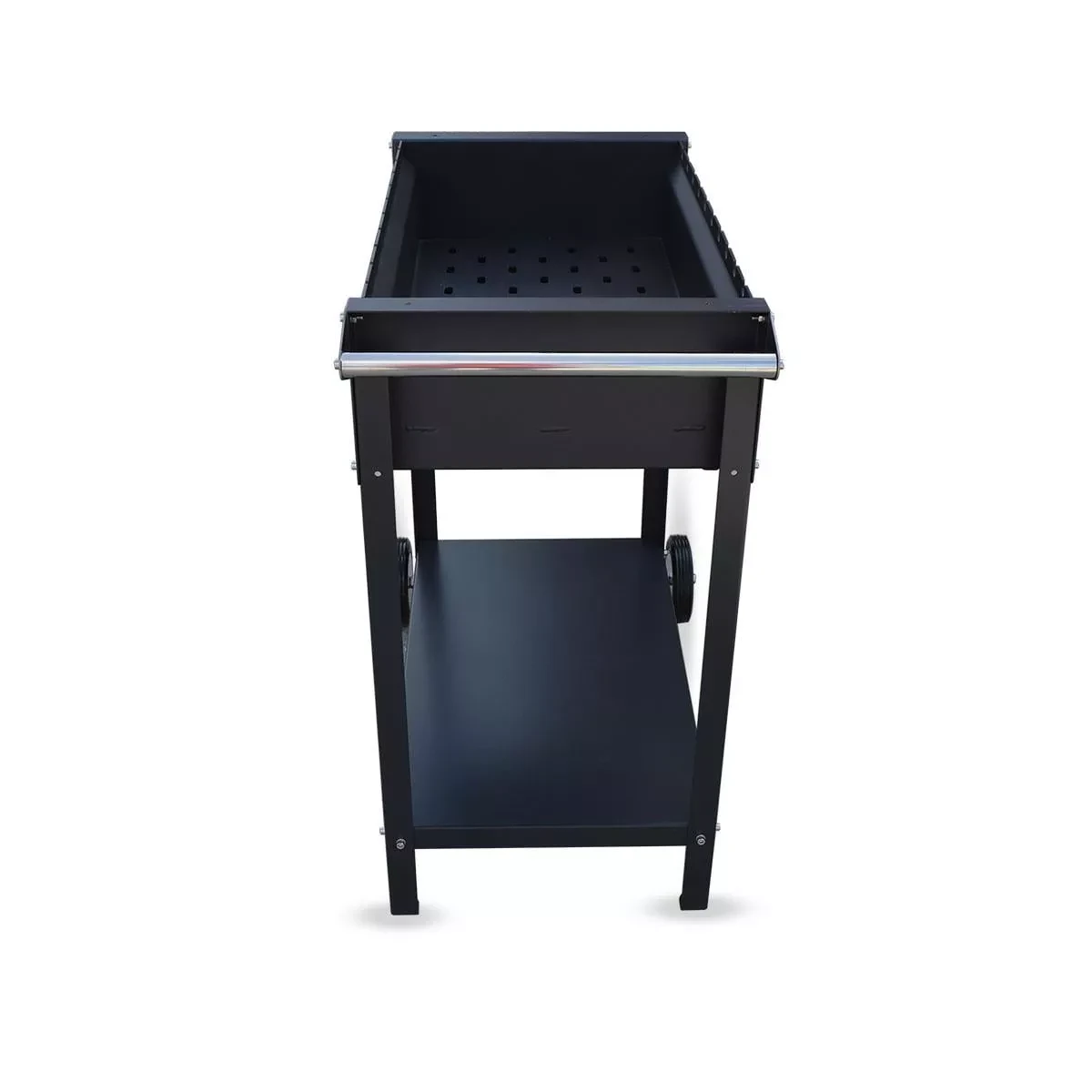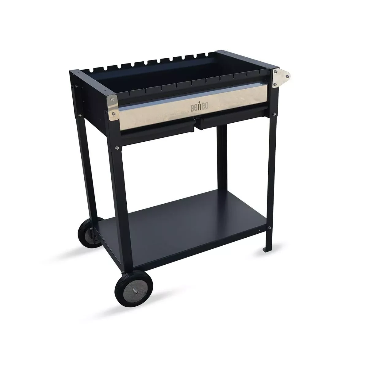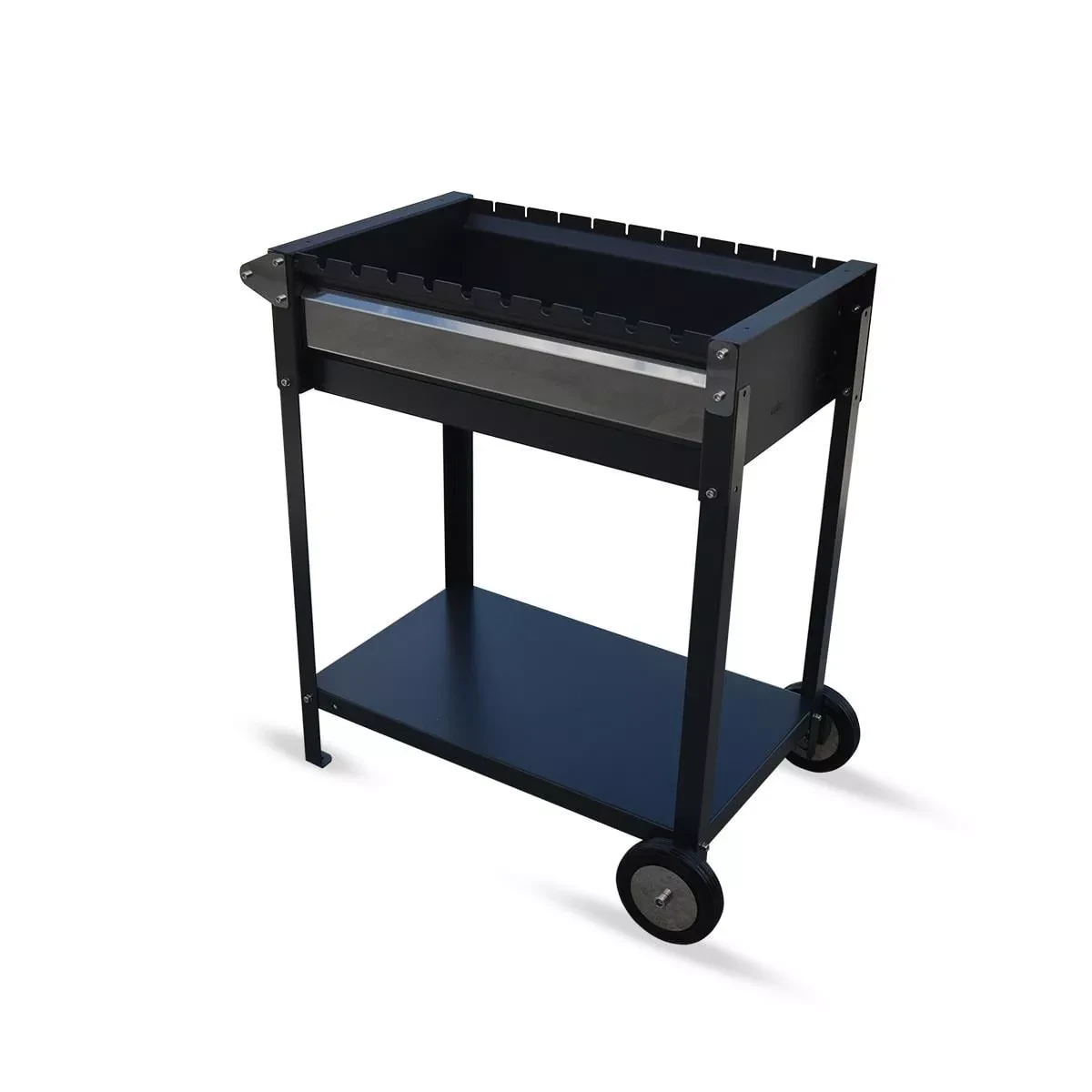 Мангал Standart відноситься до частково розбірних конструкцій. Цей якісний мангал, виконаний із чорного металу, має вогнетривке покриття. Особливість даної моделі – комбінована жаровня: з однієї сторони в ній є вирізи для фіксації шампурів, а з іншої – гриль-решітка. Трапецієподібний профіль стінок перешкоджає деформації. Для комфортного використання мангал має поличку для зберігання дров, колеса для транспортування, а також ручку, яку можна використовувати в якості вішака. Компактний і зручний мангал є лідером з продажу на нашому сайті та бестселером у покупців.