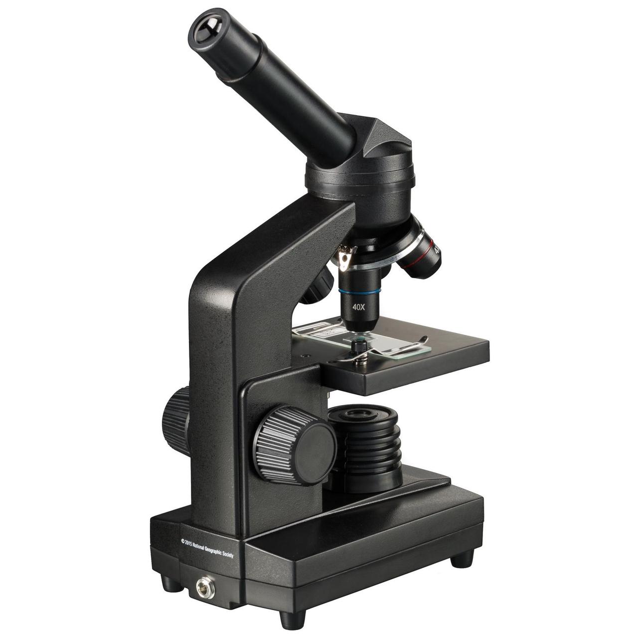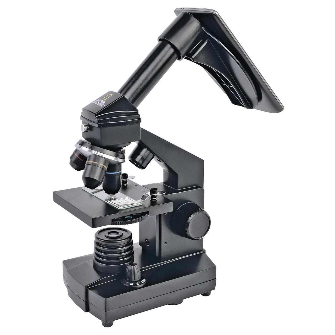 Мікроскоп National Geographic 40x-1280x (з адаптером для смартфона) добре укомплектована модель, біологічного мікроскопа, з широким набором аксесуарів. Відмінною рисою даного мікроскопа є адаптер для камери смартфона. За допомогою адаптера для смартфона, що йде в комплекті із мікроскопом, легко фотографувати об'єкти спостережень на камеру вашого смартфона. Прилад дозволяє досліджувати досить широкий діапазон препаратів та робити власні маленькі відкриття. Головне, що для початку роботи не потрібно докуповувати додаткових аксесуарів. Таким чином, мікроскоп безумовно буде цікавий і дітям і підліткам.
