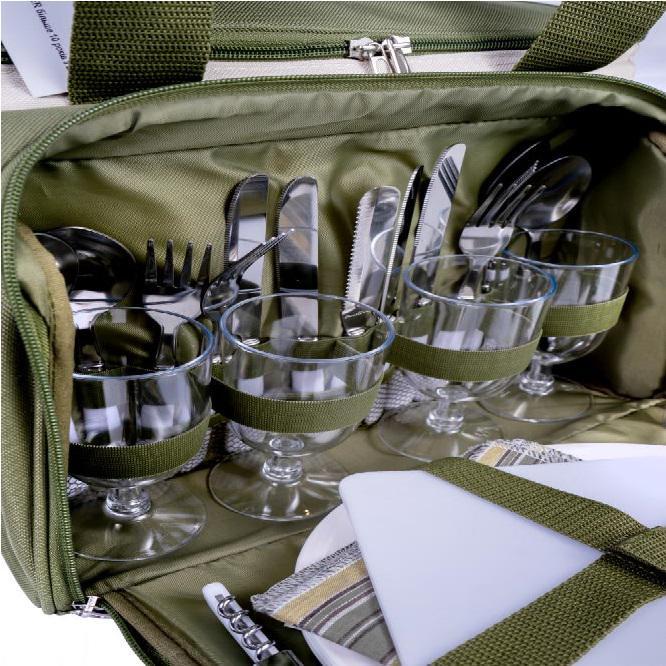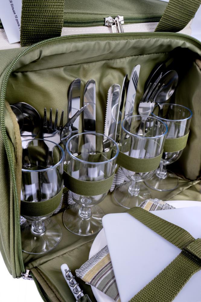Набір для пікніка Ranger Lawn - тут зібрано все, що вам знадобиться, для відпочинку на природі. Ця модель розрахована для компанії з чотирьох чоловік. У сумці ізотермічний відділ, в якому продукти збережуться свіжими, напої прохолодними і все доїде до місця в цілості й схоронності. Накрити стіл серветками з бавовняної тканини, сервірувати столовими приборами - вилками, ложками і ножами, поставити на стіл тарілки, келихи, перечницю і сільничку - все готово! Дощечка для нарізки теж під рукою, та й хлібний ніж не забутий, відкривачка для пляшок і банок. Весь посуд виготовлена з високоякісного пластику і харчової сталі. Внутрішня частина виготовлена з поліетіленвінілацетата, яка більш еластична при низьких температурах - PEVA не дубіє і не тріскається на морозі в місцях зламу. При виготовленні використовуються нешкідливі для життя і здоров'я матеріали, довговічні, прості в догляді. Для зручності комплектується ручками для перенесення і додатково йде плечовий ремінь, з регулюванням довжини. Сумка до набору для пікніка - дуже містка і компактна. Ви обов'язково оціните зручний і практичний набір для пікніка на 4 персони. Характеристики: У комплект посуду входить: тарілки - 4 шт; келихи - 4шт; ложки - 4 шт; вилки - 4 шт; ножі - 4 шт; ніж для хліба - 1шт; сільничка - 1шт; перечниця - 1шт; відкривачка, штопор, ніж (3в1 складаний) - 1шт; дощечка для нарізки - 1шт; серветки - 4 шт. - матеріал сумки: Нейлон 600D, ізотермічний наповнювач, PEVA; - колір: оливковий, бежевий; - розмір в розкладеному вигляді: 30х36х26 см (ВхДхШ); - товщина ізотермичного наповнювача: 6 мм; - розмір термовідділа: 27,5х34х20 см (ВхДхШ); - обсяг термовідділа: 20 літрів; - вага: 1,75 кг.