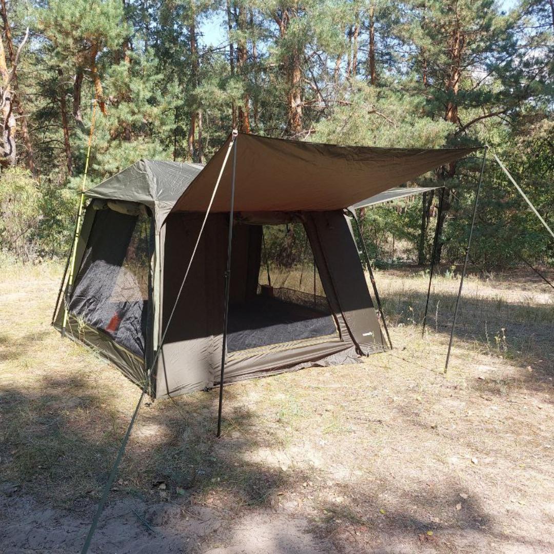 Міцна водонепроникна підлога кріпиться по периметру на блискавці, що робить її встановлення швидким та зручним. За потреби підлогу можна частково або повністю зняти. Щоб запобігти потраплянню вологи через блискавку, знизу закривається тканиною. Просторий внутрішній об’єм дозволяє перебувати всередині у повний зріст, а підняті двері у вигляді козирка створюють велику затінену зону. Під таким навісом можна комфортно розташувати крісло, стіл та спорядження, захистившись від сонця навіть у спекотний день. Намет компактно складається в зручну сумку для транспортування. У комплекті: міцні сталеві кілочки, штормові розтяжки, 4 стійки для козирків вхід і одну бічну панель, водонепроникна підлога, криша, дощова плівка на дверні вікна, сумка для транспортування. –