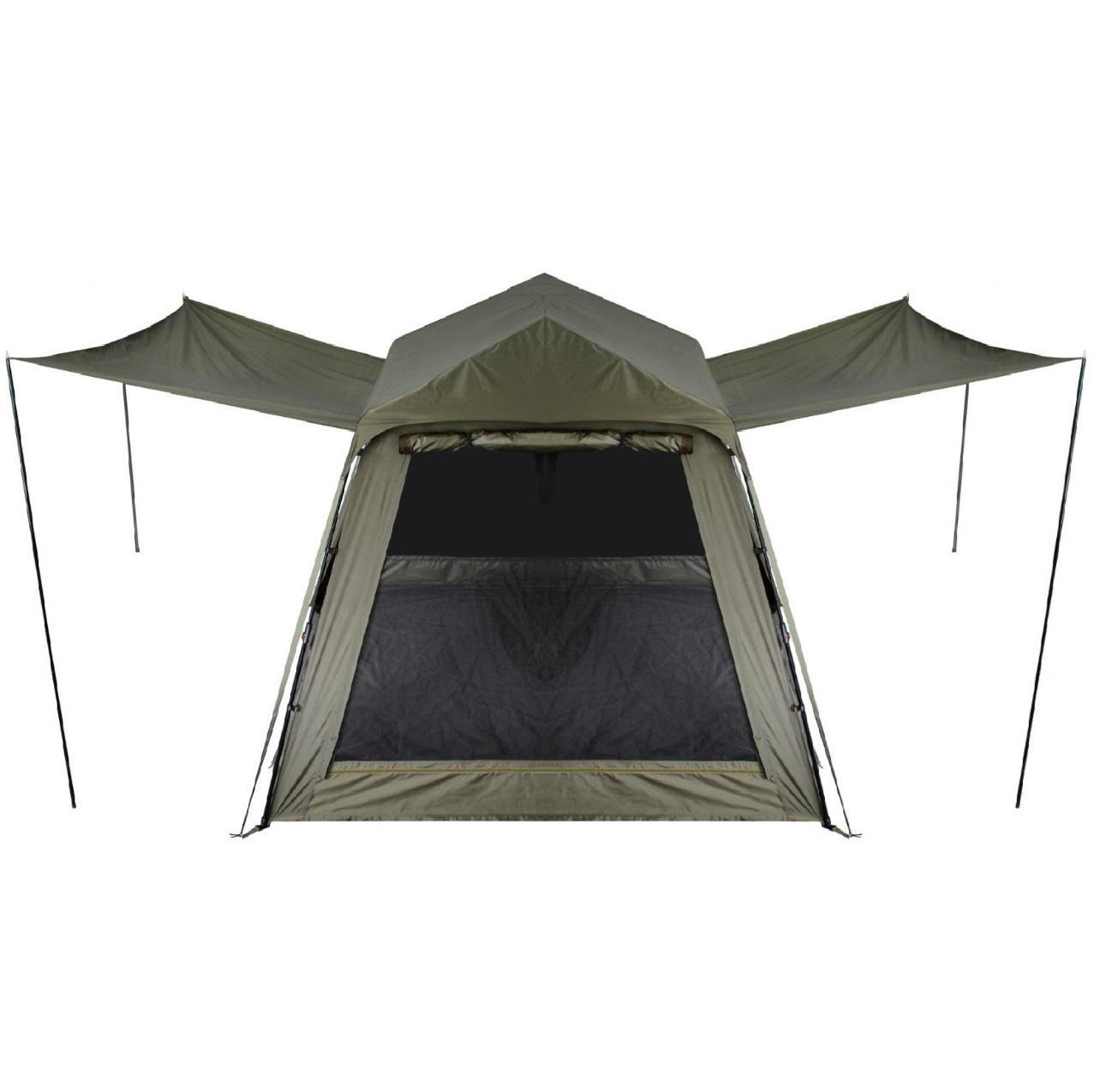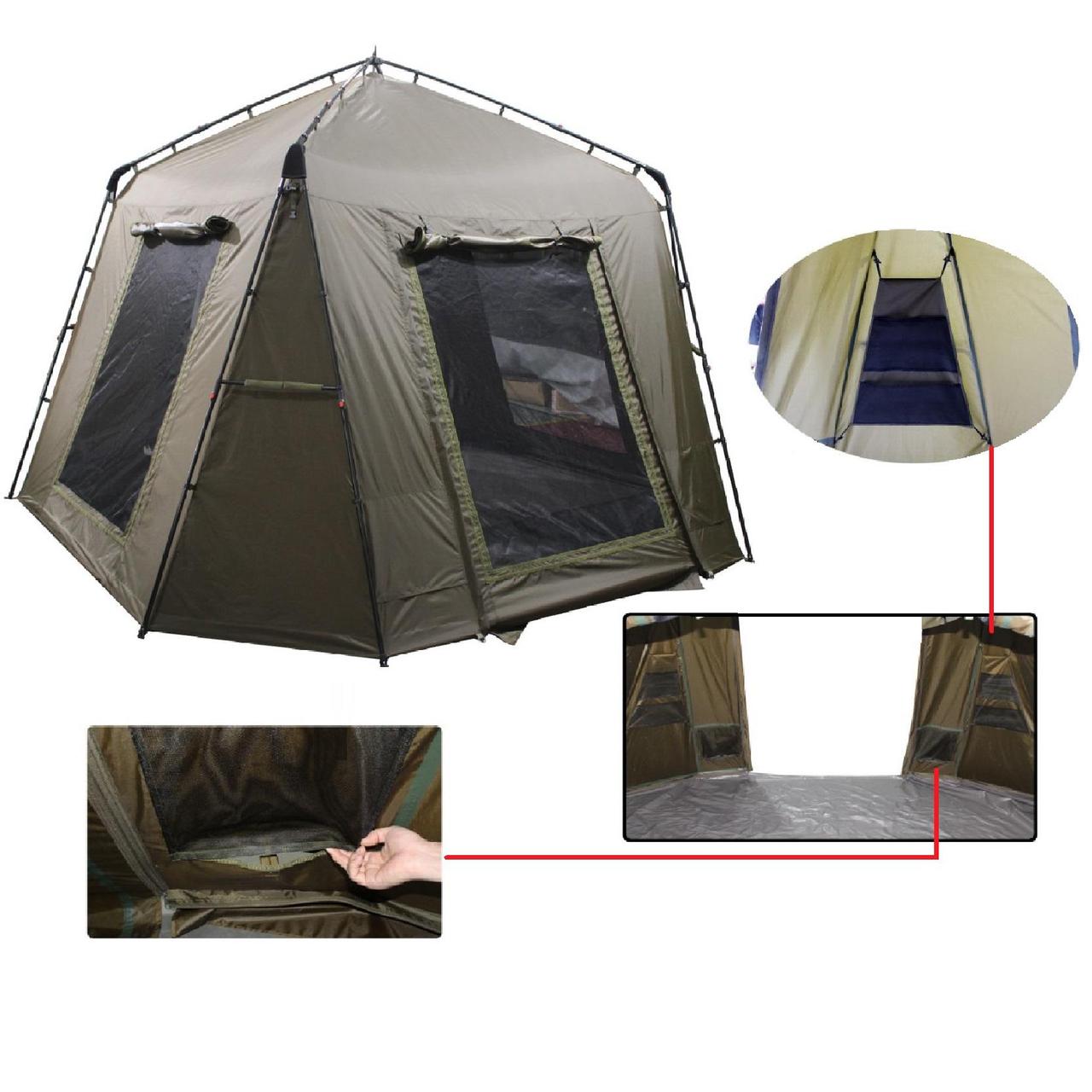 Міцна водонепроникна підлога кріпиться по периметру на блискавці, що робить її встановлення швидким та зручним. За потреби підлогу можна частково або повністю зняти. Просторий внутрішній об’єм дозволяє перебувати всередині у повний зріст, а підняті двері у вигляді козирка створюють велику затінену зону. Під таким навісом можна комфортно розташувати крісло, стіл та спорядження, захистившись від сонця навіть у спекотний день. Намет компактно складається в зручну сумку для транспортування. В наметі передбачені кишені та вентиляційні клапани. У комплекті: міцні сталеві кілочки, штормові розтяжки, стійки для козирків на кожен вхід, водонепроникна підлога, дощові плівки на дверні вікна, сумка для транспортування. –