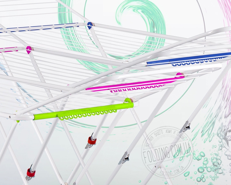 На ножках сушки установлены пластиковые насадки для защиты от царапания. Одна из ножек имеет пластиковые ролики, которые делают перемещение сушки по помещению комфортным и легким.