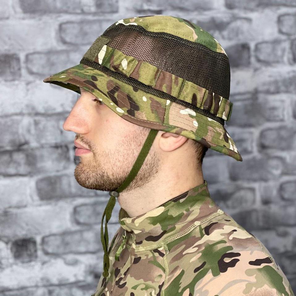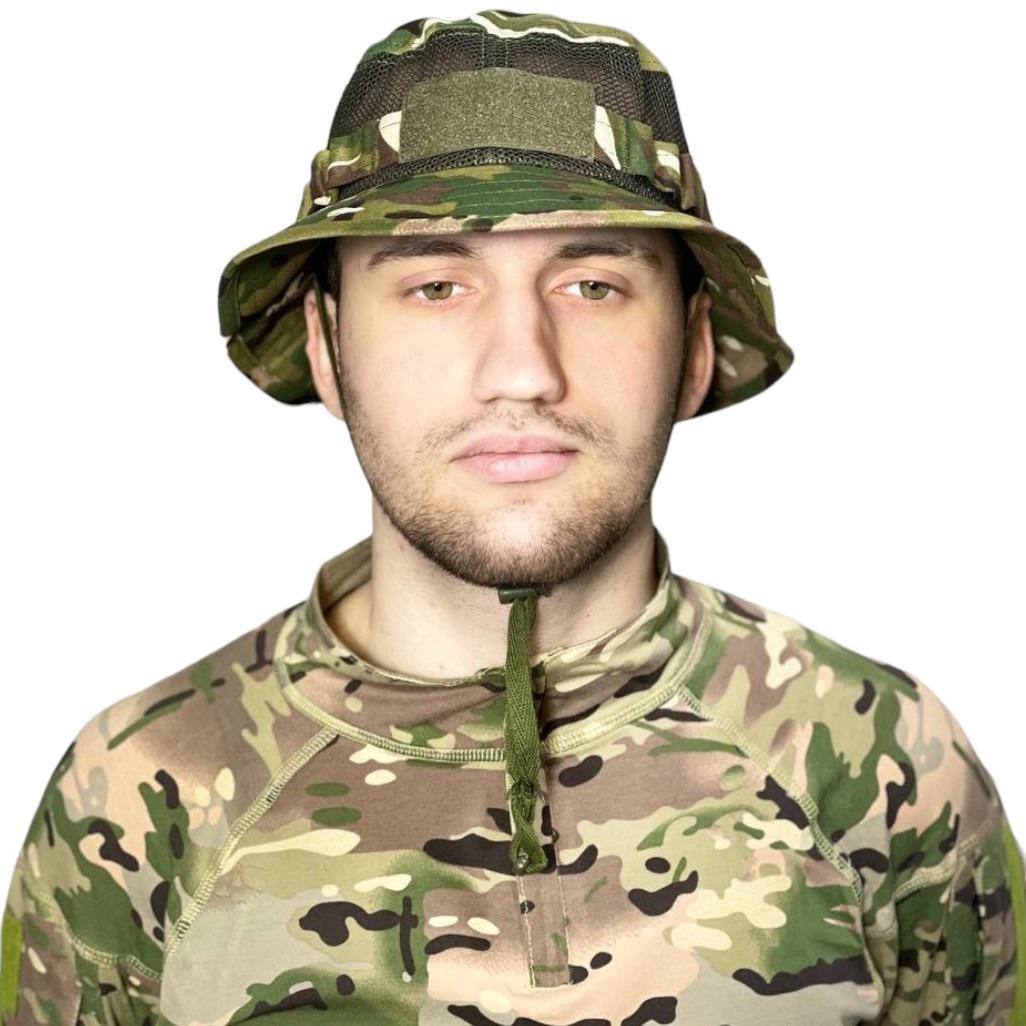 Літня військова панама – це основний польовий головний убір військовослужбовців ЗСУ у літній період. Вона захищає голову та очі від прямого сонячного випромінювання, дощу, вітру, пилу, укусів комах. Крім того, вона служить додатковим маскуванням під час несення служби. По периметру тулі розміщені зовнішні елементи для кріплення камуфляжу (трави, гілок). Поля панами досить м'які, щоб не приносити дискомфорту, проте форму тримають. На відміну від капелюха або бейсболки, її легко скрутити і покласти в кишеню. Матеріал легкий та швидко сохне. Висота панами з боку обличчя нижче, ніж із боку потилиці, авдяки цьому додатково прикривається шия. По колу прошита стрічка для доповнення маскування, шнур для фіксації, ширина полів 5,5 см. Панама військова, з міцної тканини добре захищає від сонячних променів. Виготовлена з високоміцної тканини: котону + сітка. Середня частина має сітчасту вставку, за для того аби було прохолодніше. Панама фіксується на ремені з фіксатором. Спереду передбачене місце під шеврон. Ідеально підходить для військовослужбовців, полювання, патрулювання. Стійка до вітру. Тканина: Котон; Щільність: 300 грм; Колір: мультикам; Розмір: універсальний.