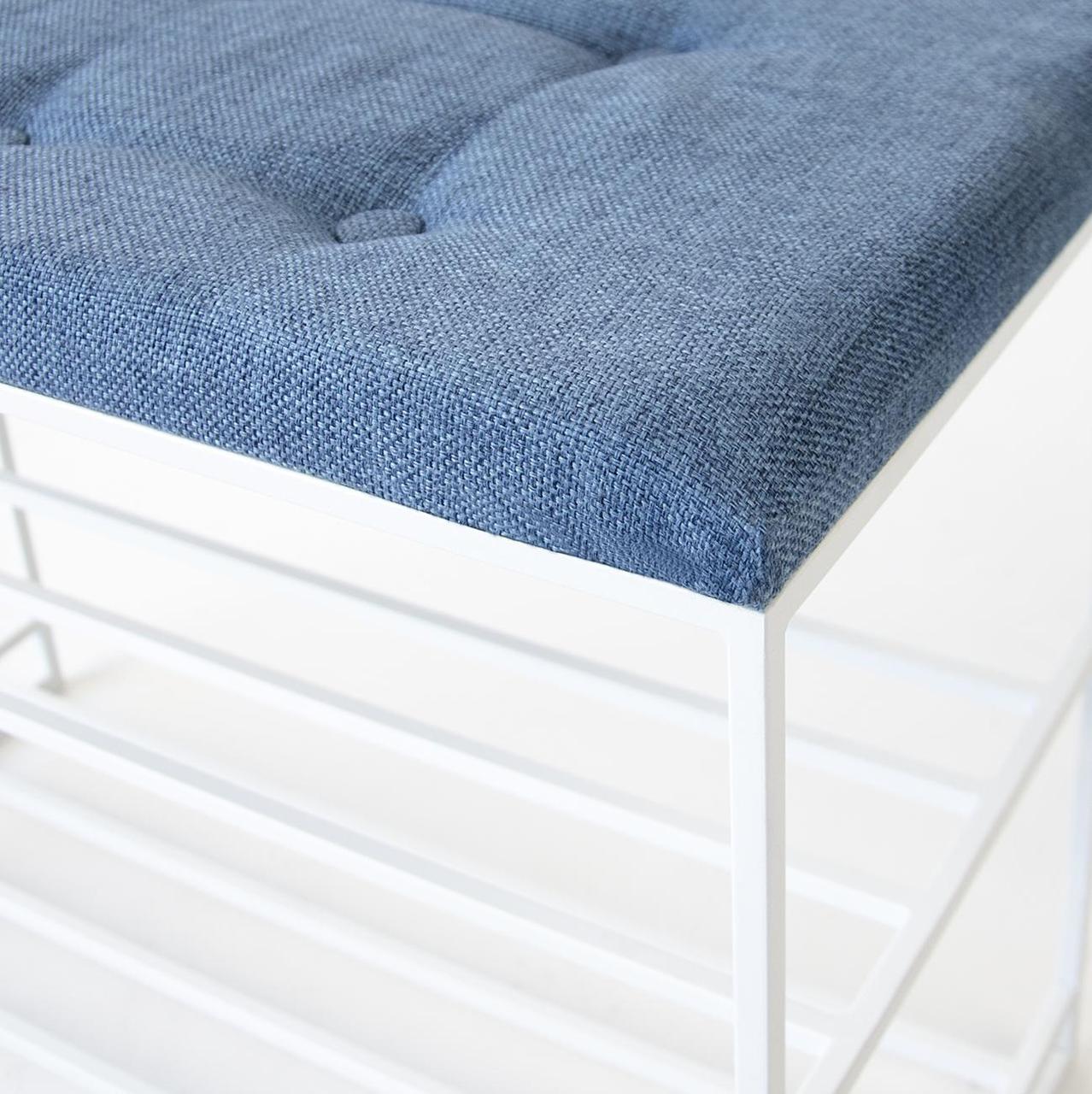 Вмістка підставка під взуття - виріб, який стане обов'язковою частиною вашої оселі. Це не лише практичний елемент для організації вашого взуття, але і стильний додаток до вашого інтер'єру. Підставка має дві металеві полиці для взуття, які виконані в білому кольорі. М'яке сидіння можете використовувати як підставку для сумок, або як місце для сидіння. Металевий каркас конструкції дуже міцний та надійний. М'яка частина виконана в блакитному кольорі тканини.