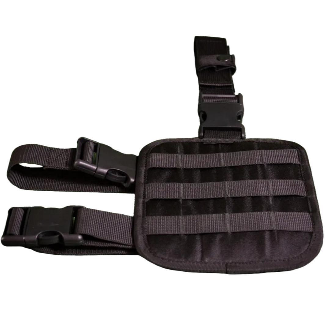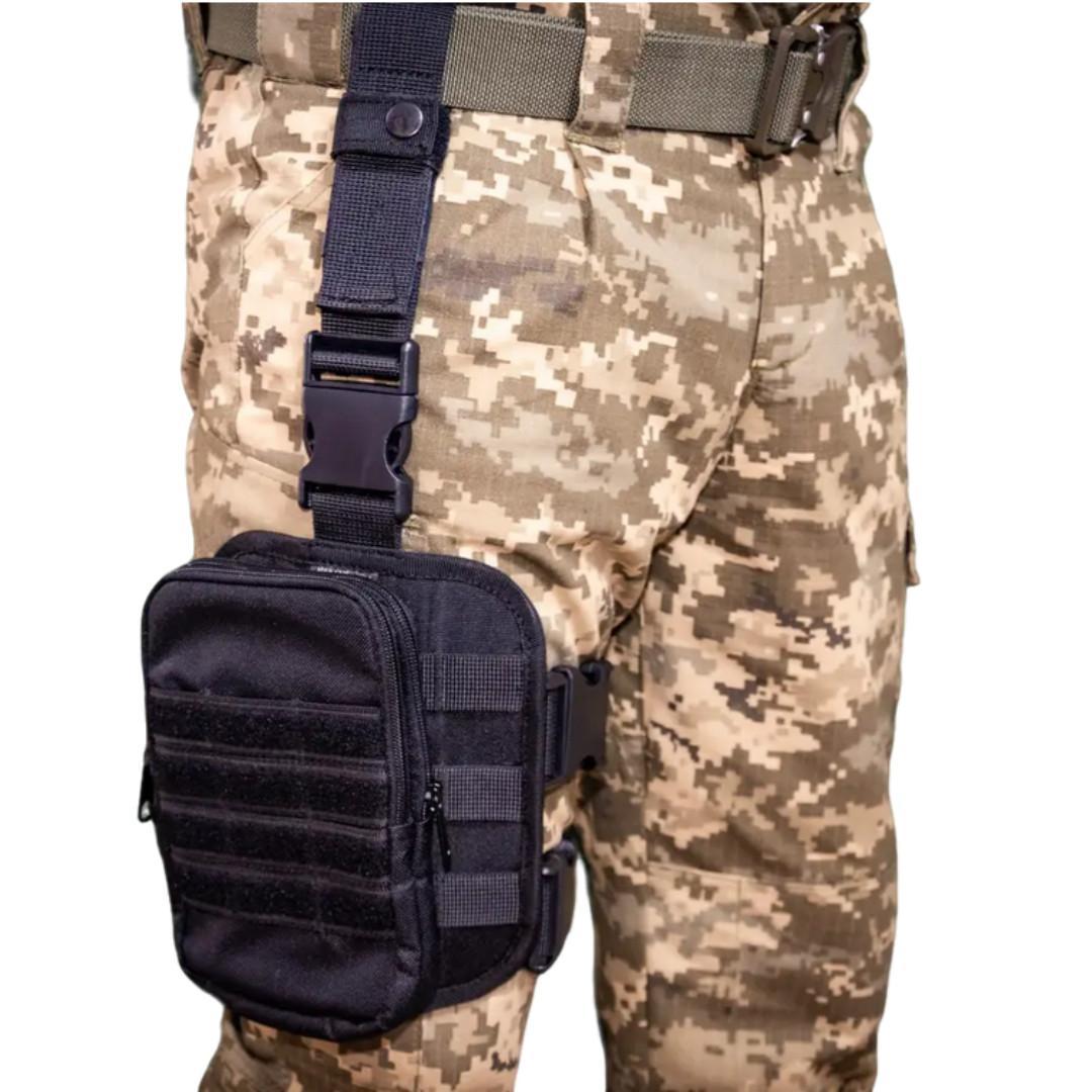 Тактична платформа на стегно з системою Molle. В умовах бойових дій кожен боєць приходить до розуміння з яким екіпіруванням йому буде комфортніше виконувати бойові завдання. Платформа підходить на ліву і на праву ногу (ремені витягуються, перевертаються). Кріплення на 3 фастекси( 2 на ногу 1 на пояс). Довжина всіх ременеів регулюється. Ця платформа підійде таким завданням: - перемістити певні підсумки на стегно, щоб стало легше і швидше їх знайти; - перерозподілити навантаження зі спини на ноги - збільшити кількість підсумків, які можна з собою взяти - вільний доступ до кишень штанів. Характеристики: Тканина: Cordura 1000D; Розмір: 15х20 см; Колір: чорний.