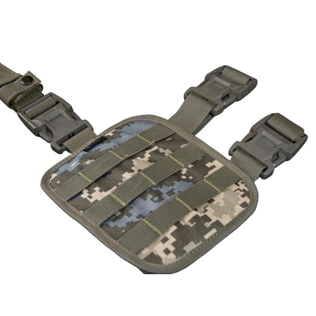 Тактична платформа на стегно з системою Molle. В умовах бойових дій кожен боєць приходить до розуміння з яким екіпіруванням йому буде комфортніше виконувати бойові завдання. Платформа підходить на ліву і на праву ногу (ремені витягуються, перевертаються). Кріплення на 3 фастекси( 2 на ногу 1 на пояс). Довжина всіх ременеів регулюється. Ця платформа підійде таким завданням: - перемістити певні підсумки на стегно, щоб стало легше і швидше їх знайти; - перерозподілити навантаження зі спини на ноги - збільшити кількість підсумків, які можна з собою взяти - вільний доступ до кишень штанів. Характеристики: Тканина: Cordura 1000D; Розмір: 15х20 см; Колір: піксель.