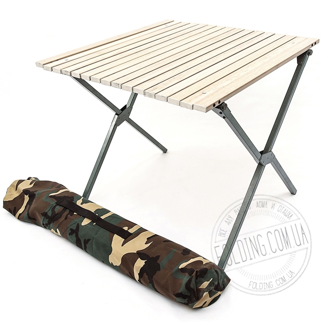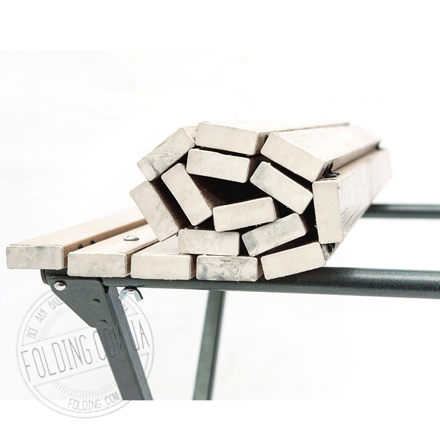 Столешница сделана из наборных планок (высококачественный пластик), соединенных между собой эластичным жгутом, который позволяет ей сворачиваться в трубочку. Столешница фиксируется на каркасе при помощи штырей.